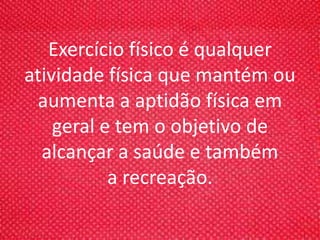 O documento discute os benefícios do exercício físico para a saúde, incluindo o fortalecimento da musculatura e do sistema cardiovascular, a perda de peso e o bem-estar geral. Ele também menciona a importância de ingerir alimentos nutritivos quando se faz exercício e dá exemplos como ginástica e esportes de atividades físicas benéficas.