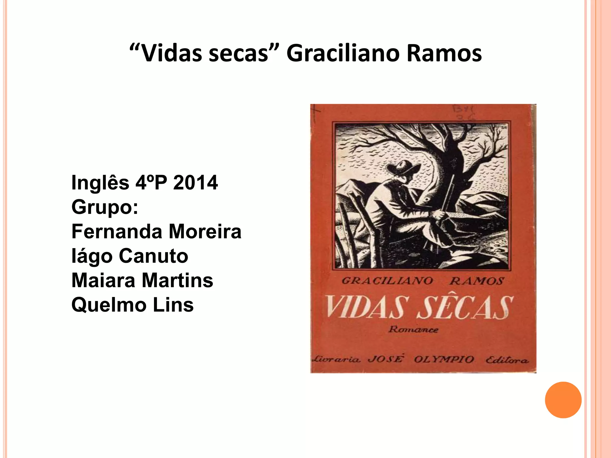 Vidas Secas", de Graciliano Ramos, narra a história de uma família nordestina pobre forçada a migrar devido à seca. A narrativa explora o regionalismo nordestino por meio de uma linguagem direta e da temática da pobreza extrema causada pela falta d'água. O romance retrata de forma realista a dura realidade dos retirantes nordestinos por meio de personagens complexos que lutam para sobreviver nas terras secas do sertão.