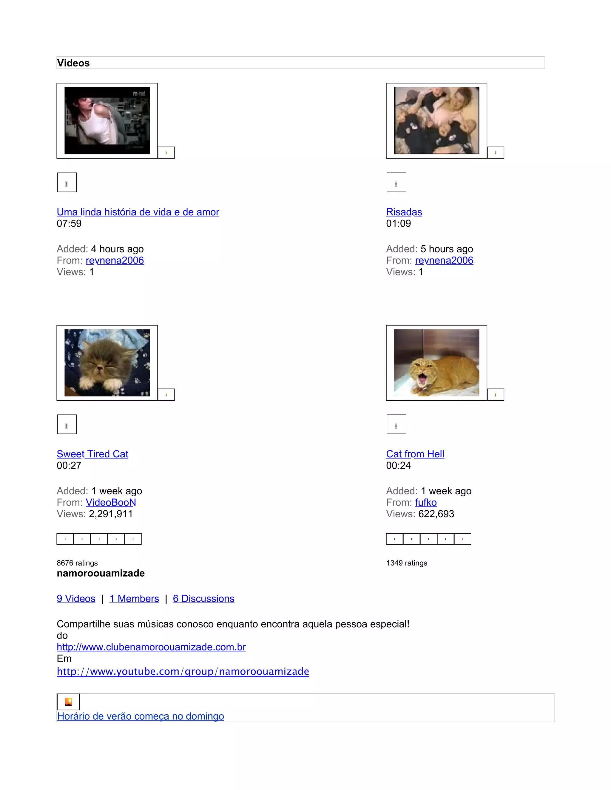 O documento lista vários vídeos curtos postados por usuários em uma página, incluindo títulos, tempo de duração, data de postagem, usuário que postou e número de visualizações. A página também promove um grupo no YouTube sobre namoro e amizade e menciona que o horário de verão começa no domingo.