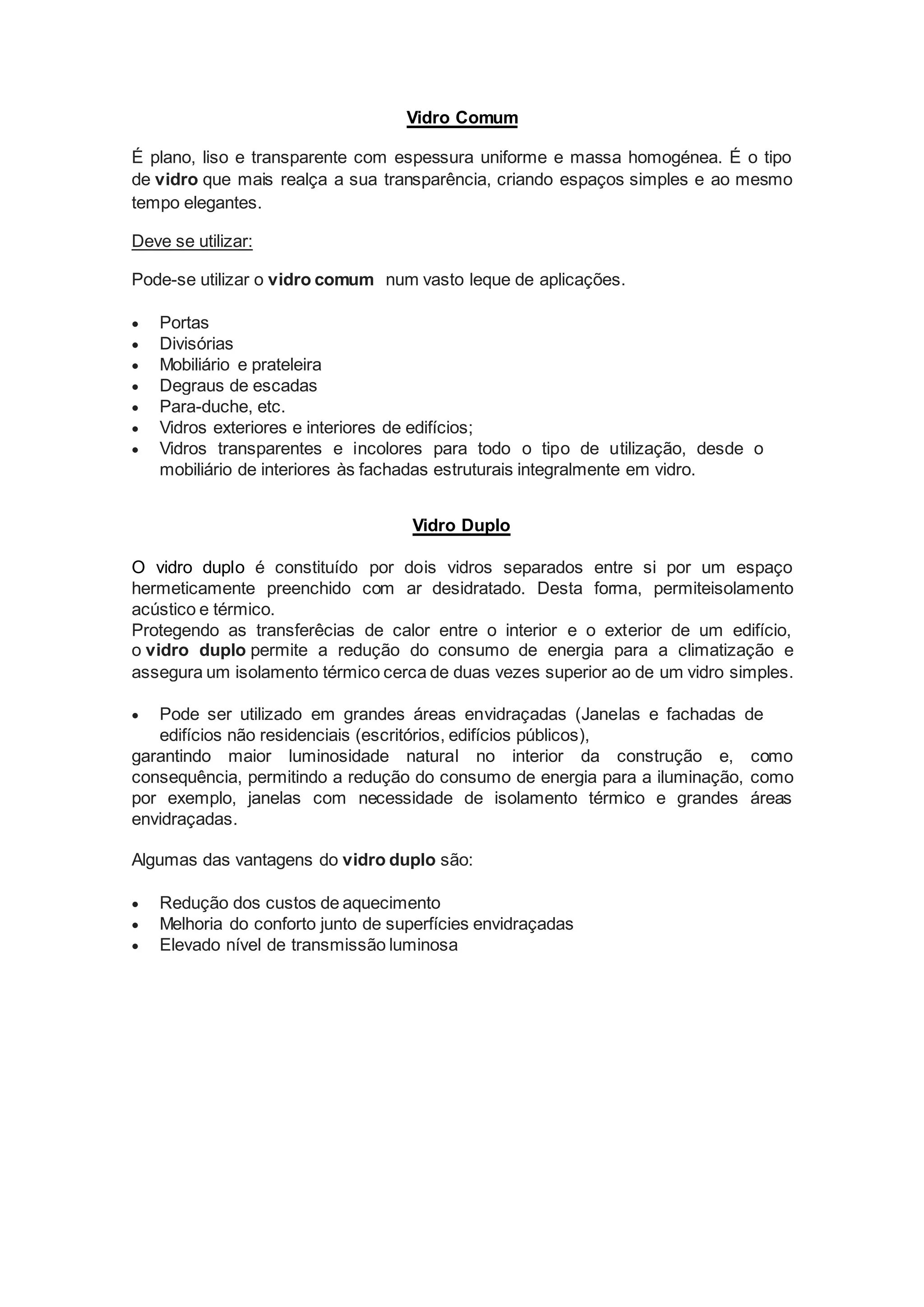 O documento descreve diferentes tipos de vidro, incluindo vidro comum, vidro duplo, vidro temperado, vidro laminado, vidro fosco, espelhos, vidro colorido e vidro reflectante, explicando suas características e aplicações comuns.