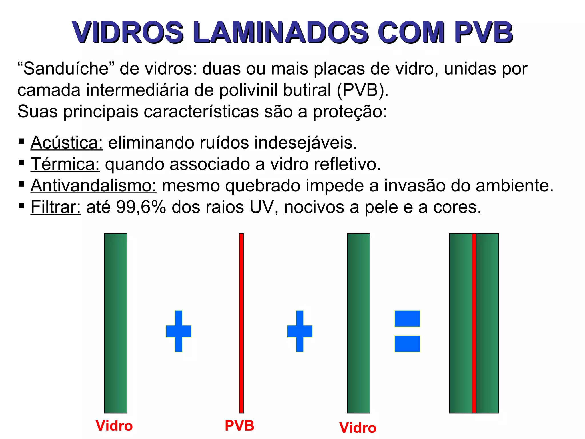 O documento descreve vidros laminados com PVB, que consistem em duas ou mais placas de vidro unidas por uma camada intermediária de polivinil butiral (PVB). Os vidros laminados fornecem proteção acústica, térmica, antivandalismo e filtragem de raios UV.