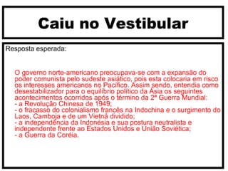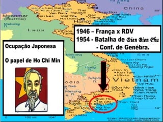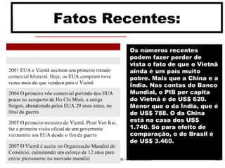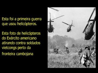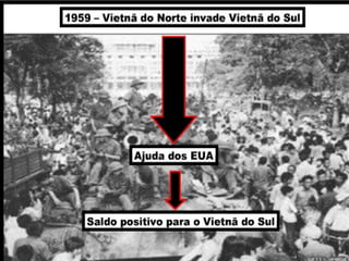 A Guerra do Vietnã durou de 1959 a 1975 e opôs o Vietnã do Norte comunista, apoiado pela União Soviética, contra o Vietnã do Sul capitalista, apoiado pelos Estados Unidos. A guerra começou como um conflito interno mas evoluiu para uma intervenção militar dos EUA devido às divergências ideológicas na região. Apesar da superioridade militar dos EUA, eles não conseguiram derrotar as forças vietnamitas e se retiraram do país em 1973, deixando o Vietnã reun