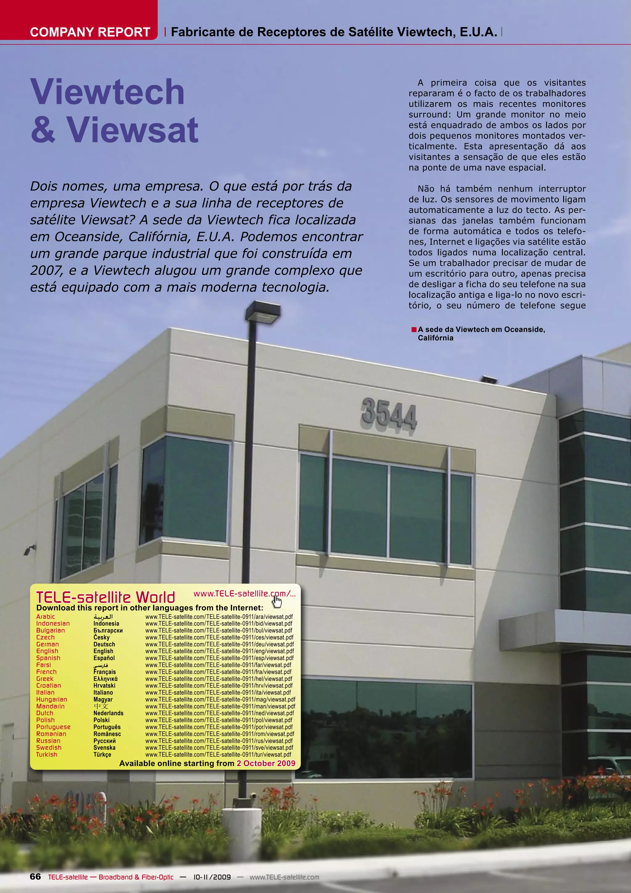 Este documento descreve a visita a sede da empresa Viewtech em Oceanside, Califórnia, EUA. A Viewtech fabrica receptores de satélite sob a marca Viewsat. A sede da empresa está equipada com a mais moderna tecnologia e é composta por 12 funcionários, a maioria jovens. A Viewtech tem experimentado crescimento constante nos últimos anos e espera continuar a crescer, especialmente nos mercados da América Latina.