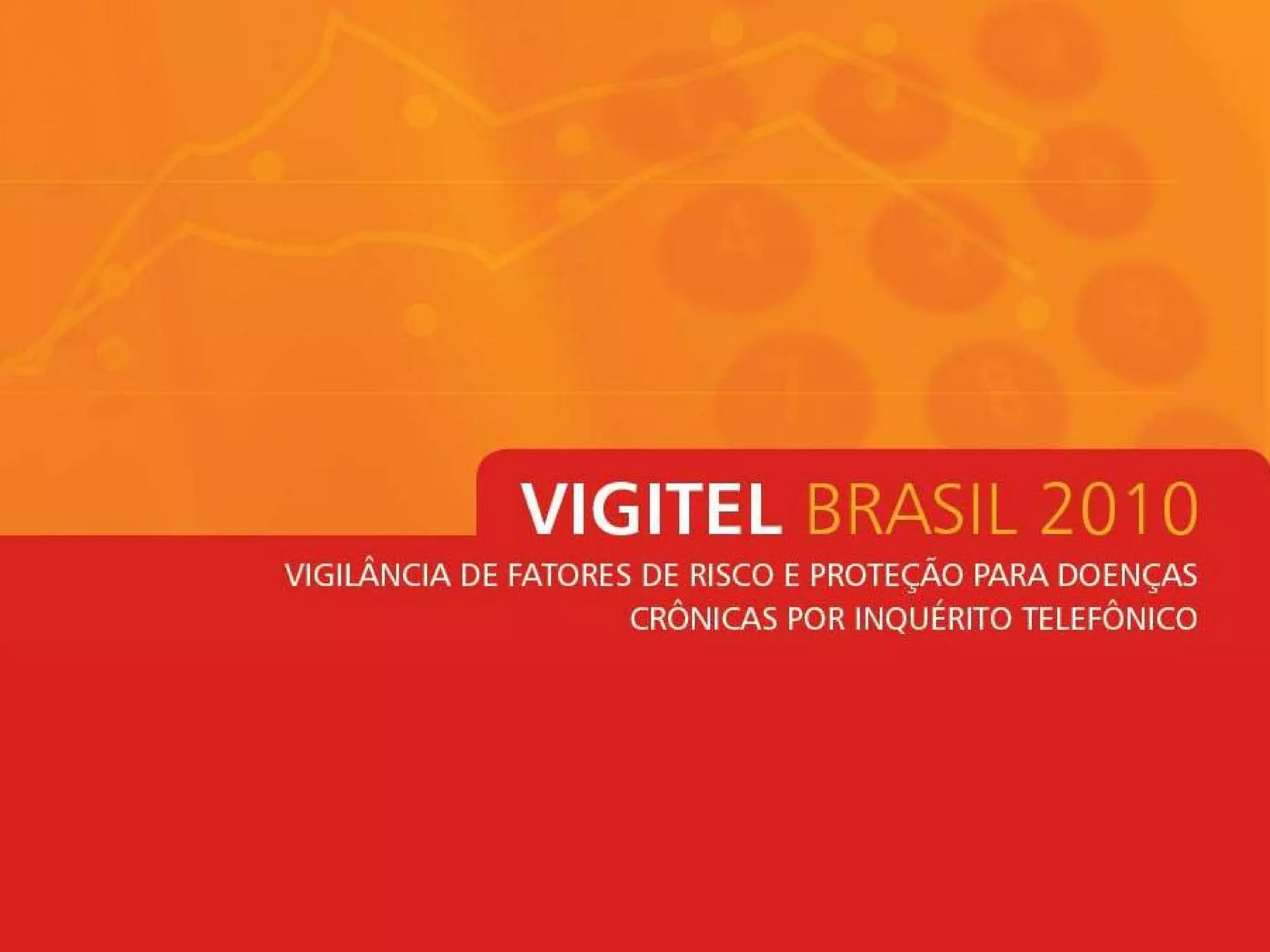 O documento descreve o sistema de monitoramento VIGITEL, que mede fatores de risco e proteção para doenças crônicas no Brasil por meio de inquéritos telefônicos anuais. O VIGITEL monitora adultos nas capitais brasileiras e tem como objetivos subsidiar ações de saúde e prevenção de doenças. Os principais resultados de 2010 incluem dados sobre tabagismo, consumo de álcool, alimentação e atividade física.