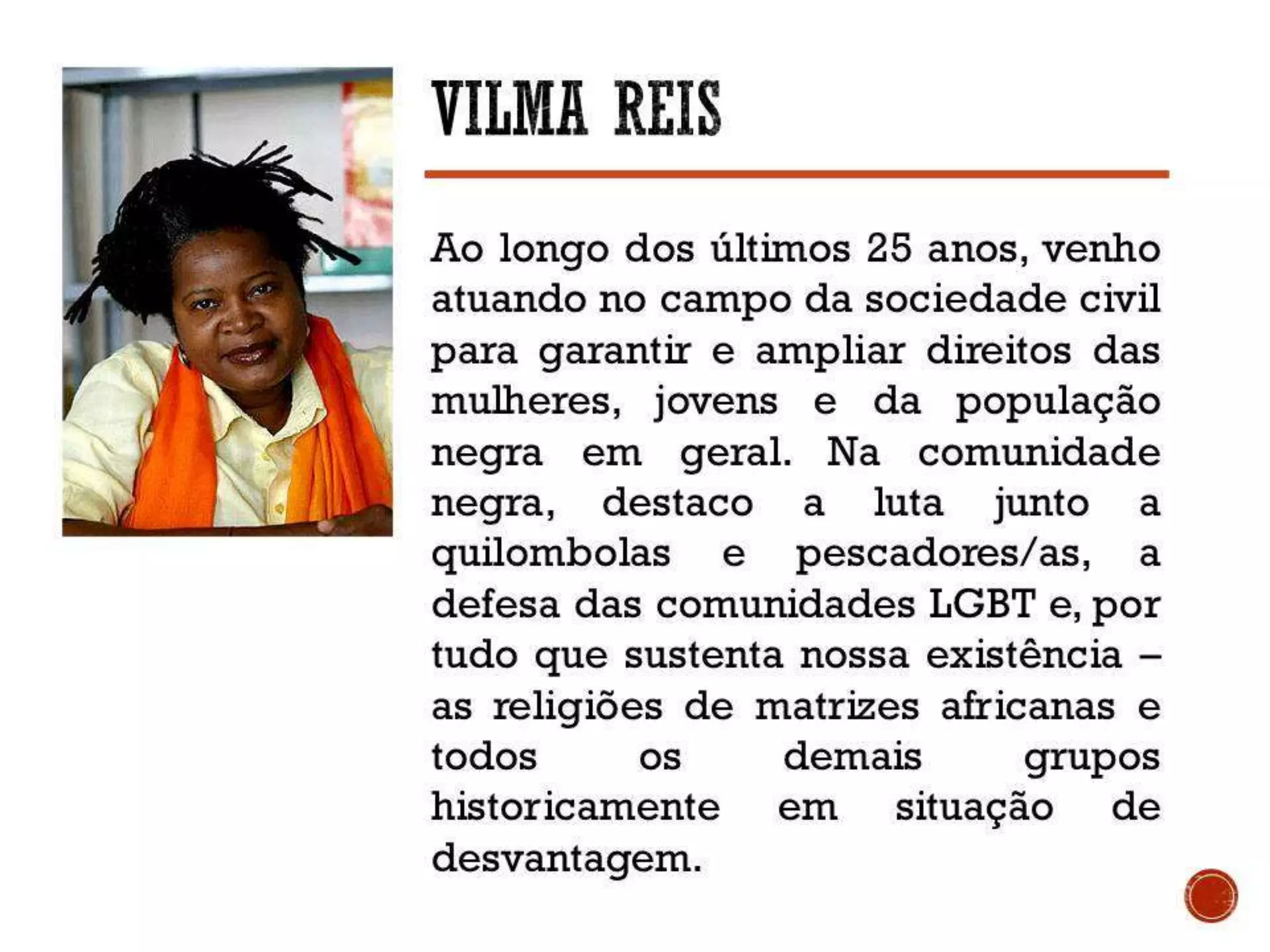 O documento resume a trajetória de 25 anos de atuação da autora em defesa dos direitos humanos, com ênfase nos direitos das mulheres, população negra e LGBT. Ela atuou em diversas frentes como defesa de quilombolas, pescadores, religiões de matriz africana e grupos marginalizados. Participou também da construção de políticas públicas e projetos de enfrentamento à violência e discriminação.