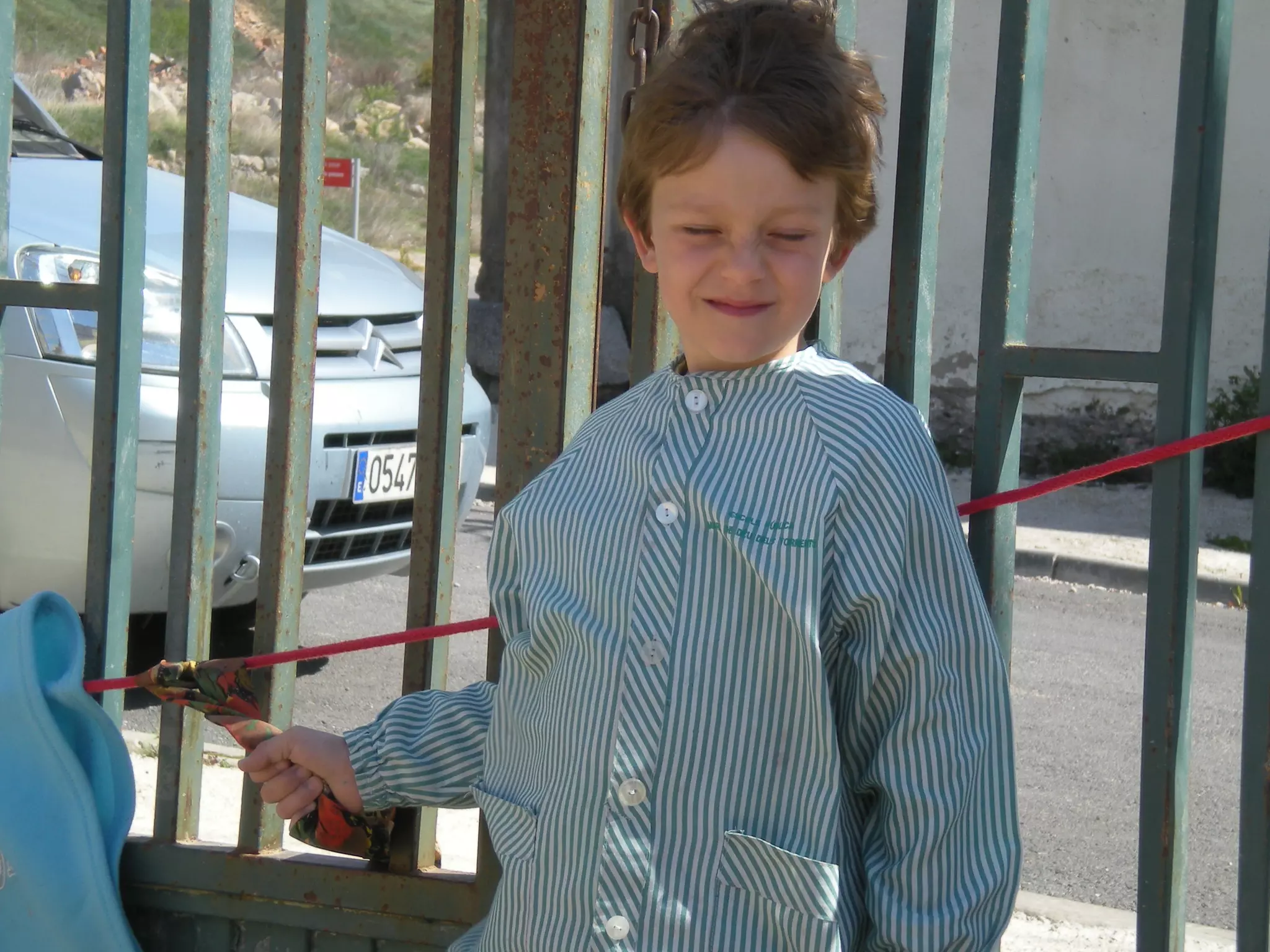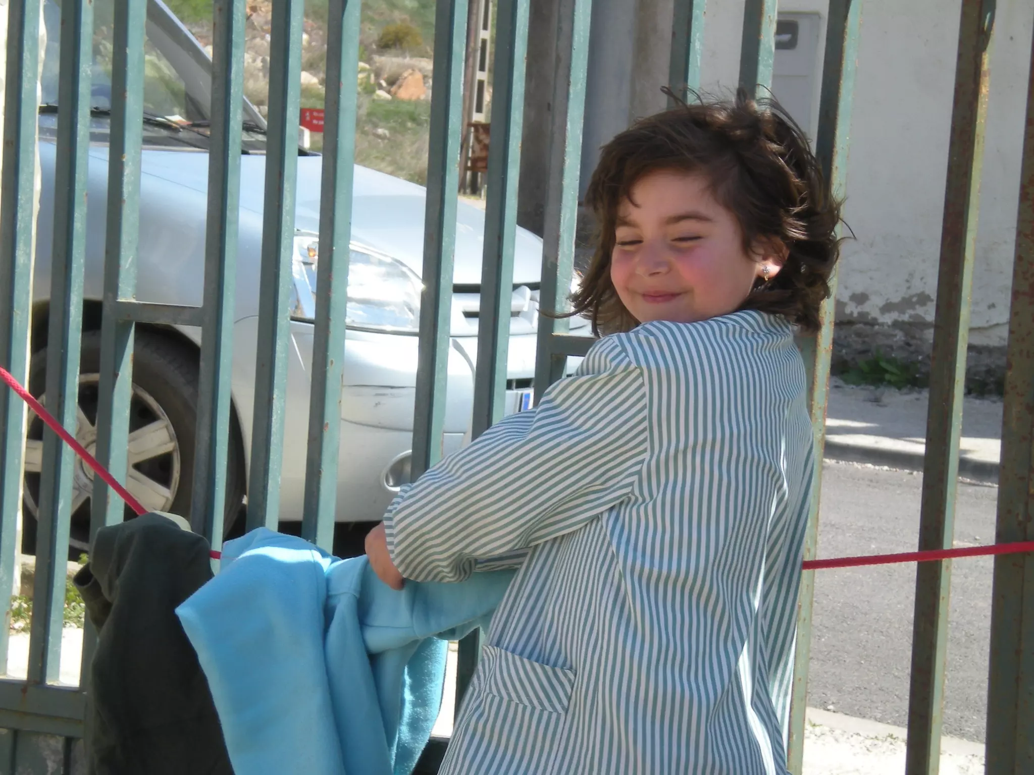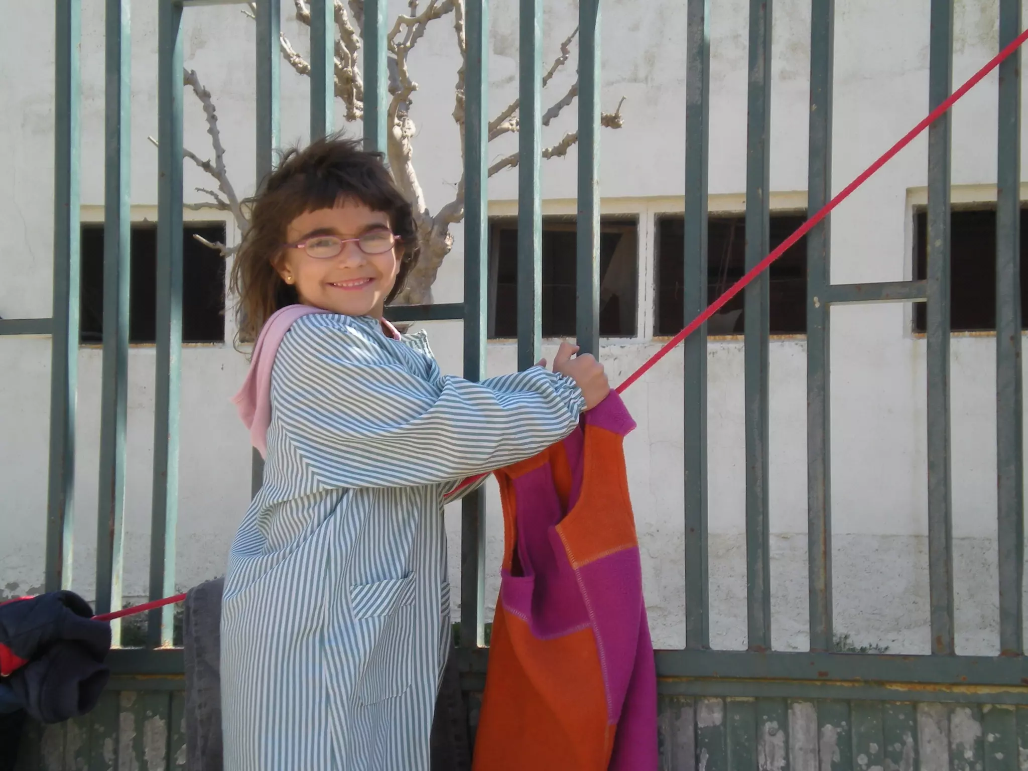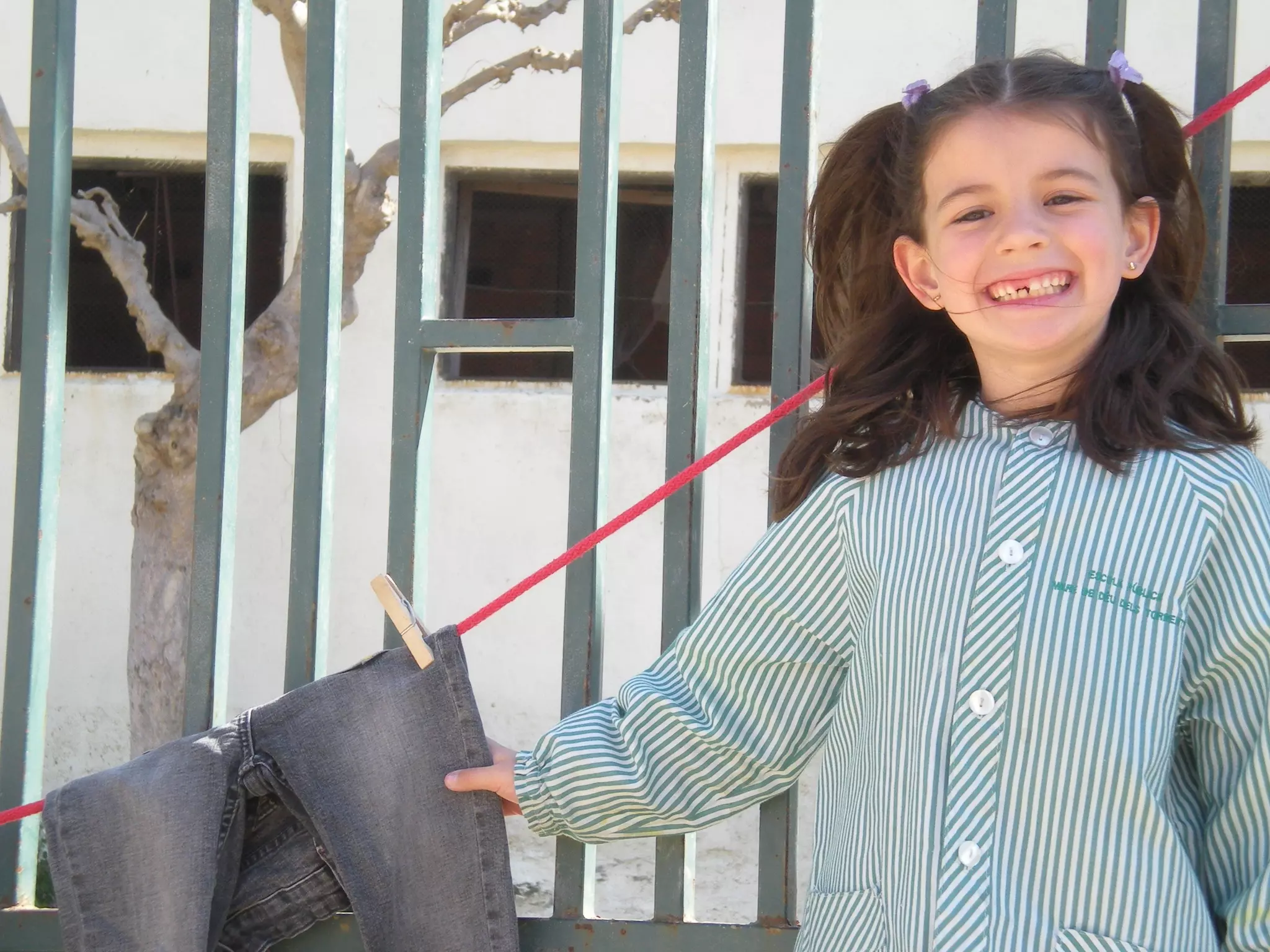 A criança repete "É meu!" sete vezes, indicando que está reivindicando posse de algo, possivelmente uma peça de roupa em uma linha de roupas.