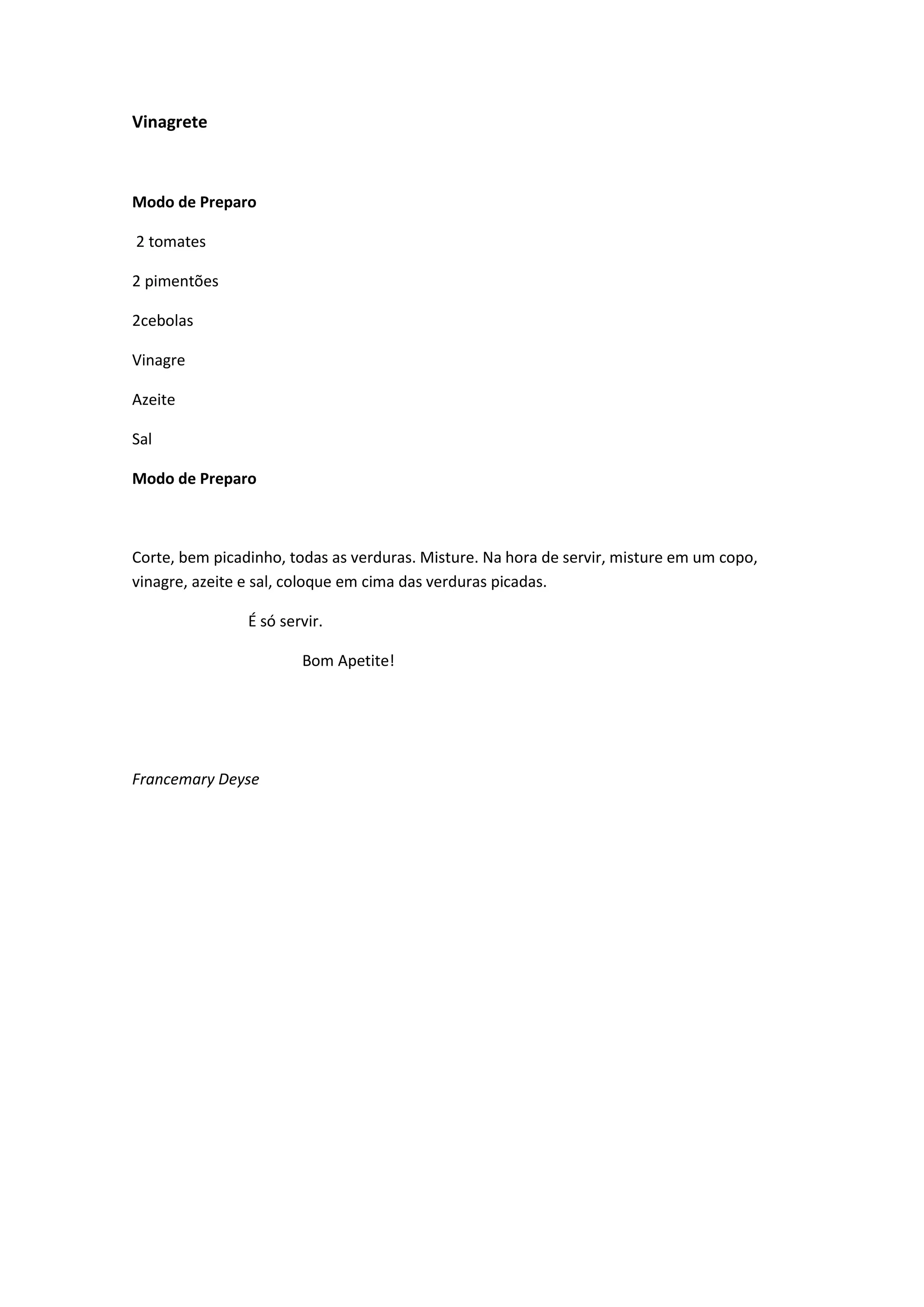 Este documento fornece instruções para preparar um vinagrete simples utilizando tomates, pimentões e cebolas picados, misturados com vinagre, azeite e sal na hora de servir. O vinagrete é uma salada fresca de verduras cruas temperada com vinagre e azeite.