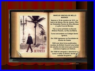 O documento descreve a vida e obra do poeta brasileiro Vinícius de Moraes. Ele nasceu no Rio de Janeiro em 1913 e se tornou um dos maiores poetas e compositores brasileiros, conhecido por popularizar a bossa nova. Vinícius escreveu centenas de poemas e letras de música ao longo de sua vida e se casou nove vezes.