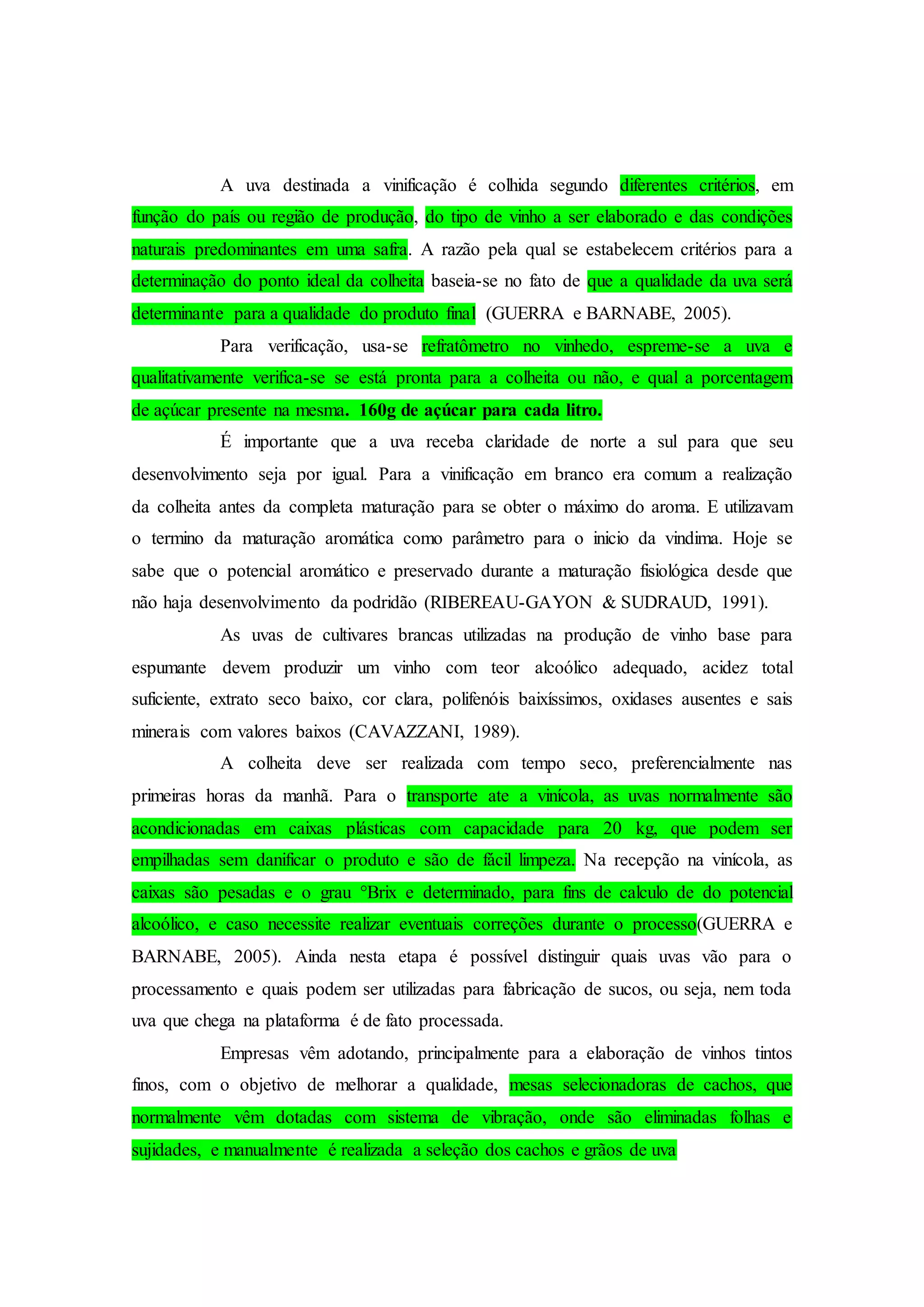 1) A colheita da uva para vinificação depende de fatores como região, tipo de vinho e condições da safra, uma vez que a qualidade da uva determina a qualidade do vinho final.
