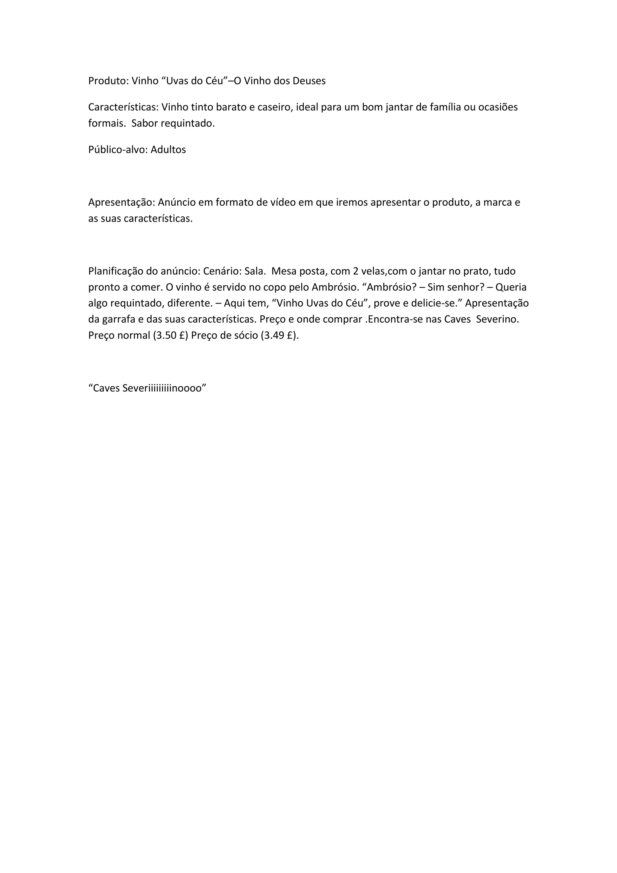 O documento descreve um anúncio de vídeo para um vinho tinto barato chamado "Uvas do Céu", destinado a adultos para jantares familiares ou ocasiões formais. O anúncio mostrará a garrafa sendo servida durante um jantar e apresentará suas características requintadas, onde comprar e preços.