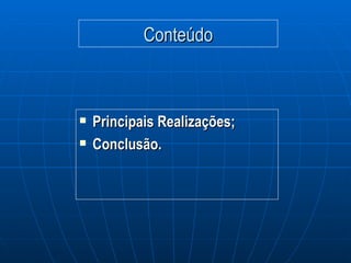 O relatório descreve as principais realizações do diretor jurídico Vinícius Silva Caruso em 2007, incluindo a abertura da empresa no foro de São Paulo, compra de edifícios, fechamento de contratos e participação em reuniões administrativas e na construção de uma loja. Vinícius conclui expressando satisfação por aprender sobre o funcionamento jurídico da empresa e esperança de que o projeto continue beneficiando outras classes.