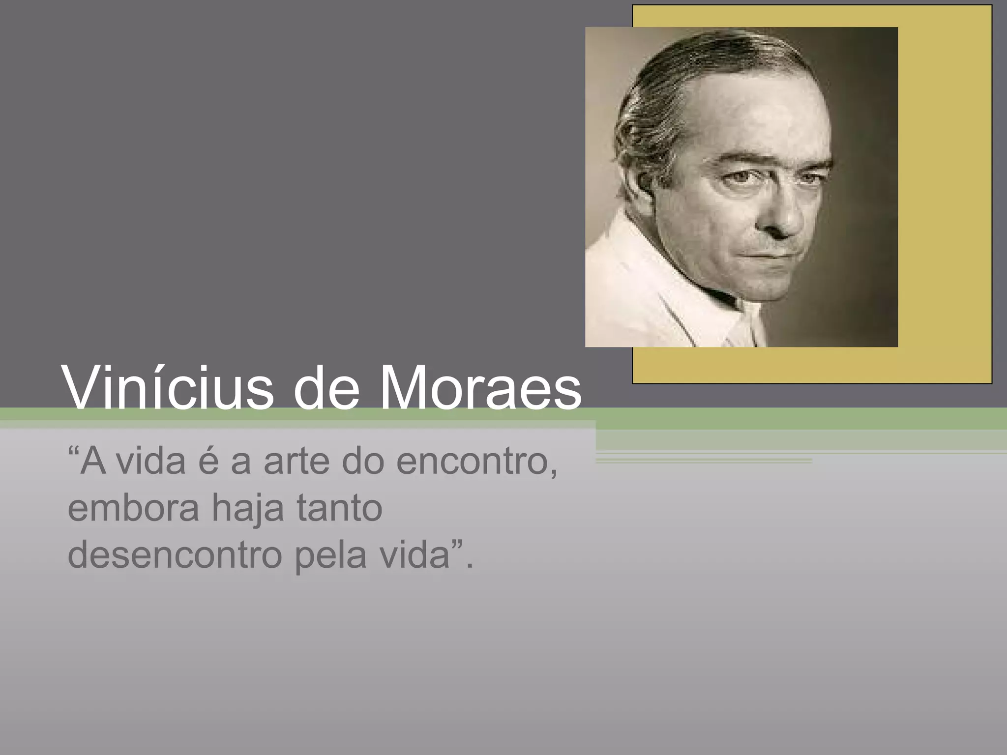 Vinícius de Moraes, nascido no Rio de Janeiro em 1913, foi um influente diplomata, dramaturgo, poeta e compositor brasileiro. Sua carreira musical se destacou a partir da década de 1950, quando tornou-se amigo de Tom Jobim, resultando em cerca de 60 composições famosas na música popular brasileira. Ele faleceu em 1980, deixando um legado literário e musical significativo.