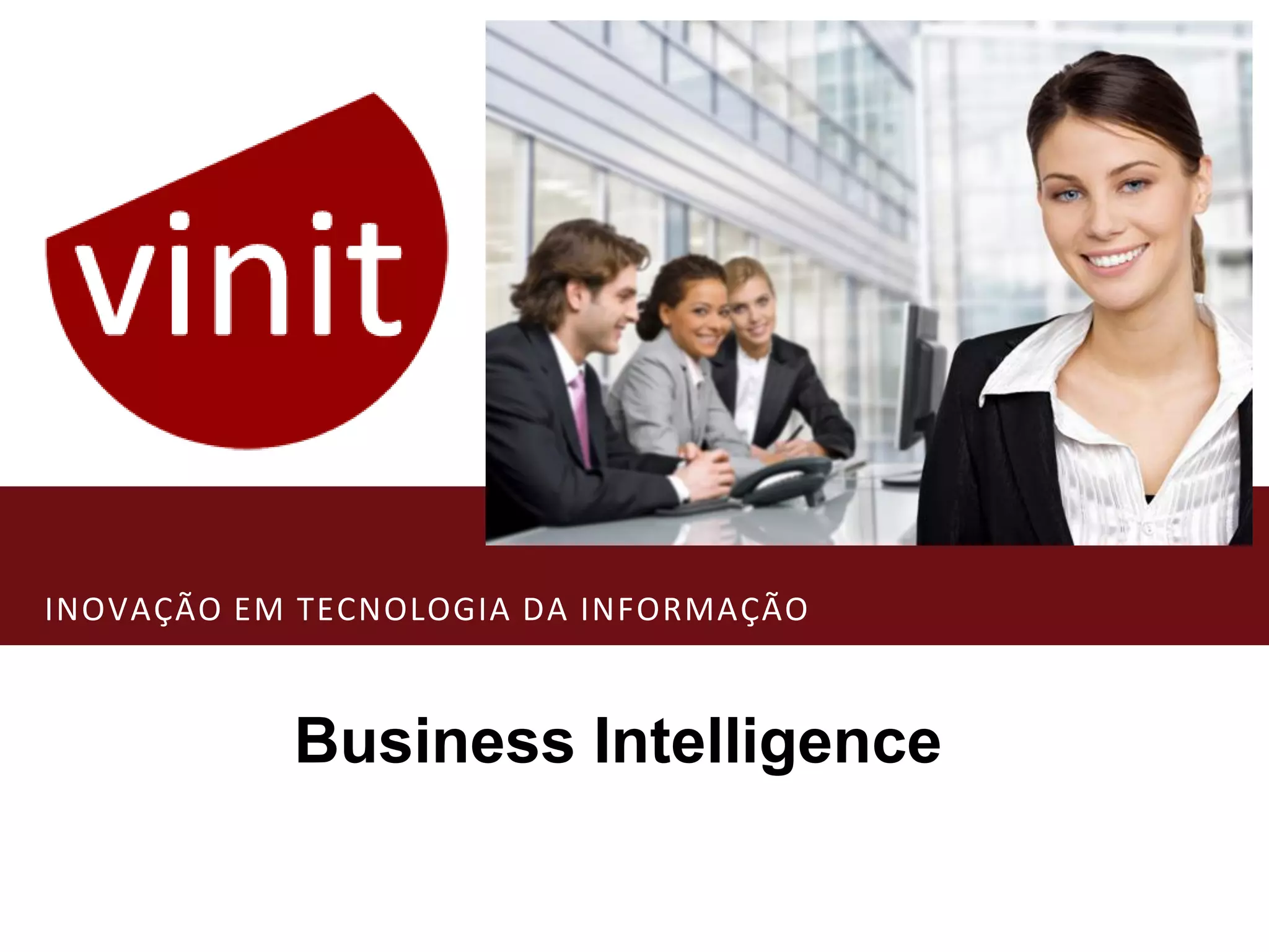 O documento discute inovação em tecnologia da informação e business intelligence. Ele apresenta conceitos sobre BI, como mercado, ferramentas, soluções e casos de sucesso. Também discute as oportunidades em projetos de BI e demonstra algumas soluções como dashboards, relatórios e análises.
