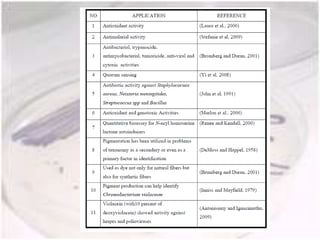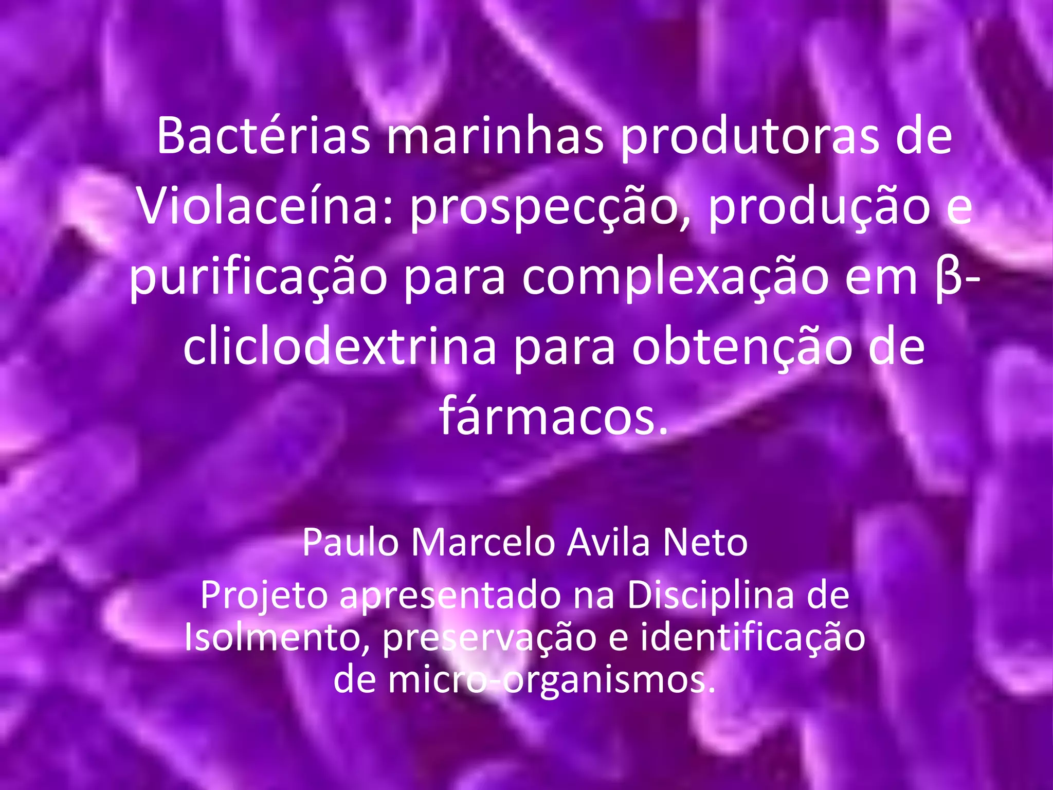 O documento descreve a produção, purificação e complexação da violaceína, um pigmento produzido por bactérias marinhas, com β-ciclodextrina para obtenção de fármacos. A violaceína é produzida por bactérias como Cromobacterium violaceum via quorum sensing e possui propriedades antimicrobianas e anticancerígenas. O documento detalha os métodos para isolamento das bactérias produtoras a partir de amostras marinhas, produção, purificação da violaceína e sua complexa