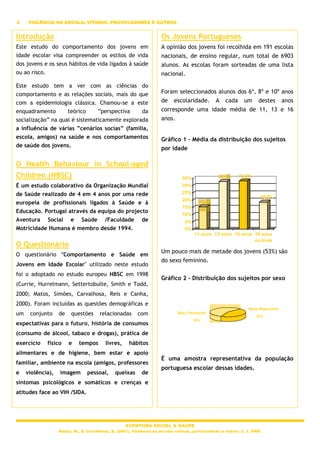 O documento descreve um estudo sobre violência na escola entre estudantes portugueses. Os resultados mostram que os rapazes se envolvem mais em atos de violência, com pico aos 13 anos. Estudantes envolvidos costumam ter menos ligação à família e escola, além de envolvimento com tabaco, álcool, drogas e brigas.