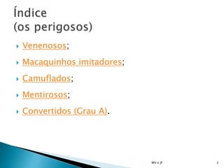 O documento classifica diferentes tipos de pessoas de acordo com seu comportamento. Ele descreve "venenosos" que gostam de brigas, "imitadores" que seguem os mais populares, "camuflados" que fingem amizade antes de atacar, e "vítimas" que sofrem dos outros.