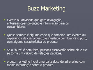 O documento discute os conceitos de buzz marketing, marketing viral e boca a boca. Define buzz marketing como eventos ou atividades que geram entusiasmo e informação sobre produtos de forma inusitada. Marketing viral tenta espalhar mensagens de forma rápida entre consumidores, enquanto boca a boca é a opinião compartilhada entre pessoas. Também lista técnicas para promover esses tipos de marketing, como entretenimento, competições e causas nobres.