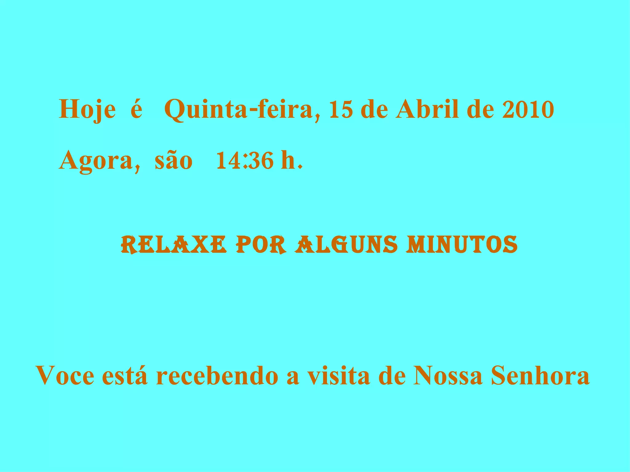 Este documento convida o leitor a relaxar por alguns minutos e receber a visita de Nossa Senhora. Ele incentiva o leitor a compartilhar sua experiência com amigos e confiar que todas as suas necessidades serão atendidas se deixar Nossa Senhora seguir em sua caminhada para visitar mais lugares.