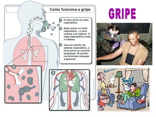 A gripe é uma doença respiratória causada por um vírus diferente do que causa resfriados. A gripe costuma ter sintomas mais graves como febre, dores no corpo e cansaço. A caxumba é uma doença altamente contagiosa transmitida por gotículas de saliva que pode causar inchaço nas glândulas salivares ou complicações mais graves. O sarampo é uma doença viral transmitida por gotículas de saliva que causa febre, manchas vermelhas e outros sintomas.