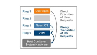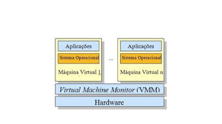 O documento discute a história e conceitos da virtualização, incluindo máquinas virtuais, hypervisors e paravirtualização. Explica como a virtualização melhora o aproveitamento de hardware, reduz custos e suporta aplicações legadas, apesar de possíveis problemas de desempenho e segurança. Também lista soluções como VMware e Xen e usos como consolidação de servidores e nuvem.