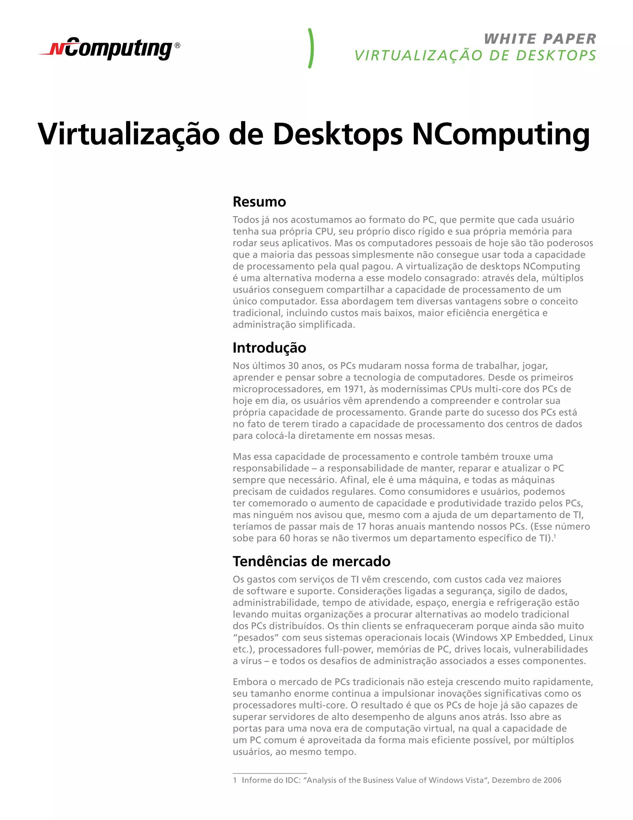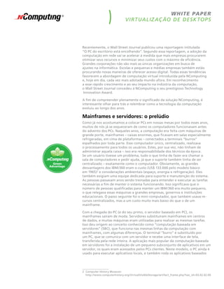 A virtualização de desktops permite que múltiplos usuários compartilhem a capacidade de processamento de um único computador através de três componentes: 1) software que cria desktops virtuais; 2) protocolo que fornece interface de usuário eficiente; 3) dispositivos de acesso econômicos que se conectam aos usuários. Essa abordagem oferece benefícios como menor custo em comparação ao modelo tradicional de um computador por usuário.