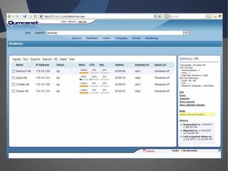 O documento discute Virtual Desktop Infrastructure (VDI), que permite desktops virtuais para usuários remotos, reproduzindo a experiência de uso local. VDI oferece vantagens como segurança de dados, mobilidade, entrega rápida de desktops e isolamento de usuários. O documento também descreve a tecnologia Spice usada para VDI e o projeto de código aberto OSDVT para implementar VDI totalmente com softwares livres.