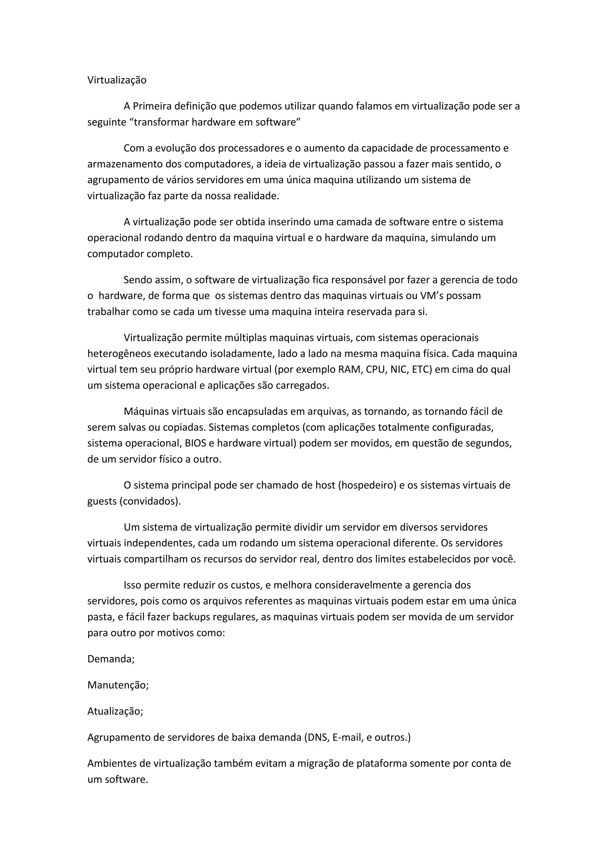 A virtualização permite transformar hardware em software, agrupando vários servidores físicos em uma única máquina virtual através de uma camada de software. Isso melhora a gestão e reduz custos, permitindo isolar e mover sistemas operacionais entre servidores rapidamente. A virtualização suporta diversos tipos como servidores, desktops, armazenamento, aplicações e redes.