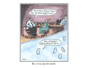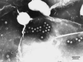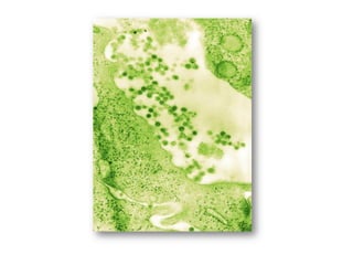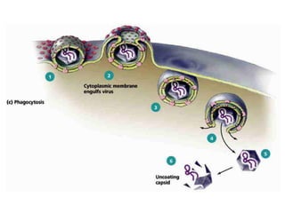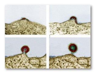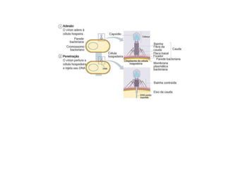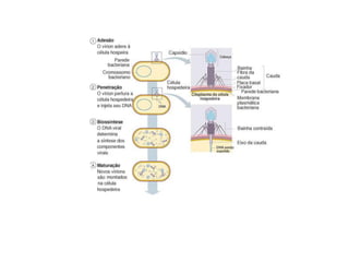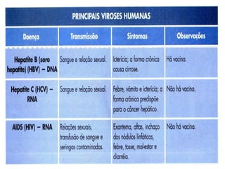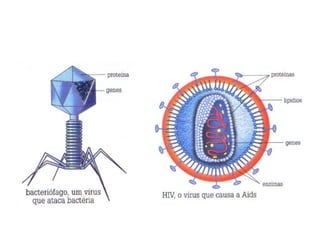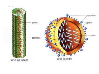O documento descreve o que são vírus, suas características, tamanhos comparativos em relação a células, estruturas, classificações, genomas e ciclos de vida. Explica que vírus são parasitas intracelulares obrigatórios menores que bactérias, sem células ou metabolismo próprios, e detalha os ciclos de replicação de adenovírus, vírus da gripe e HIV.