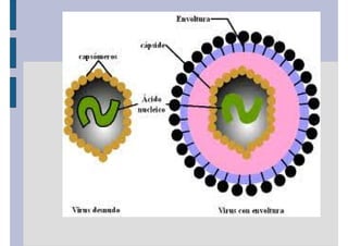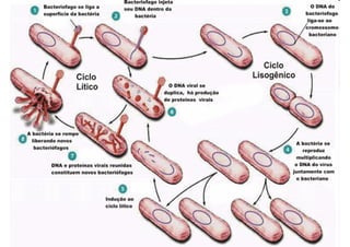 O documento discute vírus, suas estruturas e formas de reprodução. Vírus são partículas microscópicas que contêm material genético e se reproduzem invadindo células vivas. Eles podem se reproduzir através de ciclos líticos ou lisogênicos e causar doenças como resfriado, sarampo e AIDS. O texto também aborda príons, proteínas anormais ligadas a doenças neurodegenerativas como a doença da vaca louca.