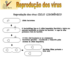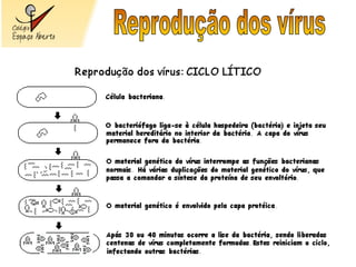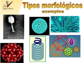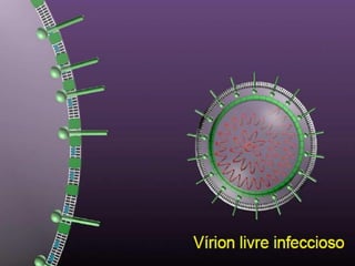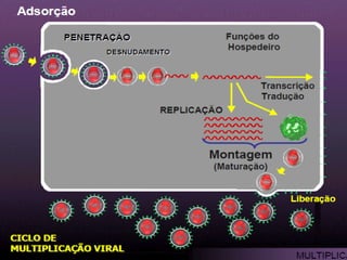 O documento descreve a diversidade de formas e tamanhos dos vírus, detalha sua estrutura básica e mecanismos de infecção. Também aborda diferentes modos de transmissão, incluindo gotículas, picadas de insetos e contato com objetos contaminados, juntamente com medidas de controle como vacinação. Além disso, apresenta exemplos específicos de vírus e suas respectivas características patológicas e preventivas.