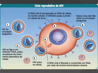 O documento discute vários tipos de vírus e bactérias, como se transmitem e doenças causadas. Apresenta o ciclo do HIV/AIDS e como o vírus ataca e destrói o sistema imunológico. Também descreve como ocorrem a transmissão e prevenção de doenças virais como gripe, sarampo, rubéola, poliomielite e hepatite.