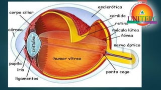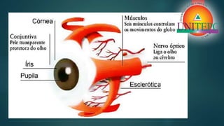 O documento descreve a anatomia e o funcionamento do olho humano. Detalha as três camadas que compõem a parede do globo ocular - túnica fibrosa, vascular e retina - e as estruturas internas como córnea, cristalino, humor aquoso e vítreo. Também explica os tipos de células sensíveis à luz presentes na retina - cones e bastonetes - e seus papéis na visão em cores e baixa luminosidade. Por fim, apresenta alguns defeitos visuais como miopia, hipermetropia, presbi