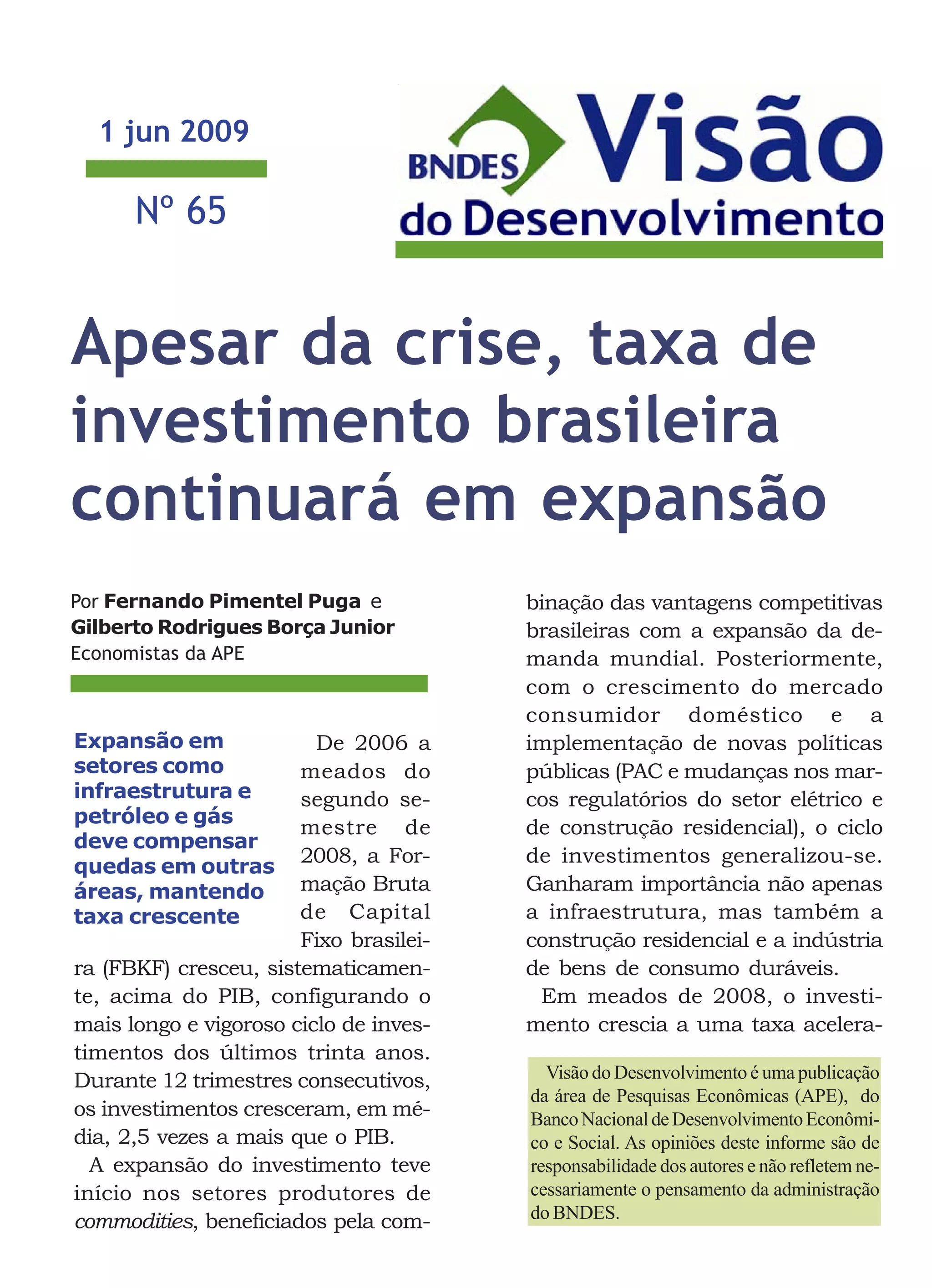 1) A taxa de investimento no Brasil continuou crescendo de 2006 a meados de 2008 impulsionada por setores como infraestrutura, petróleo e gás e construção residencial.
