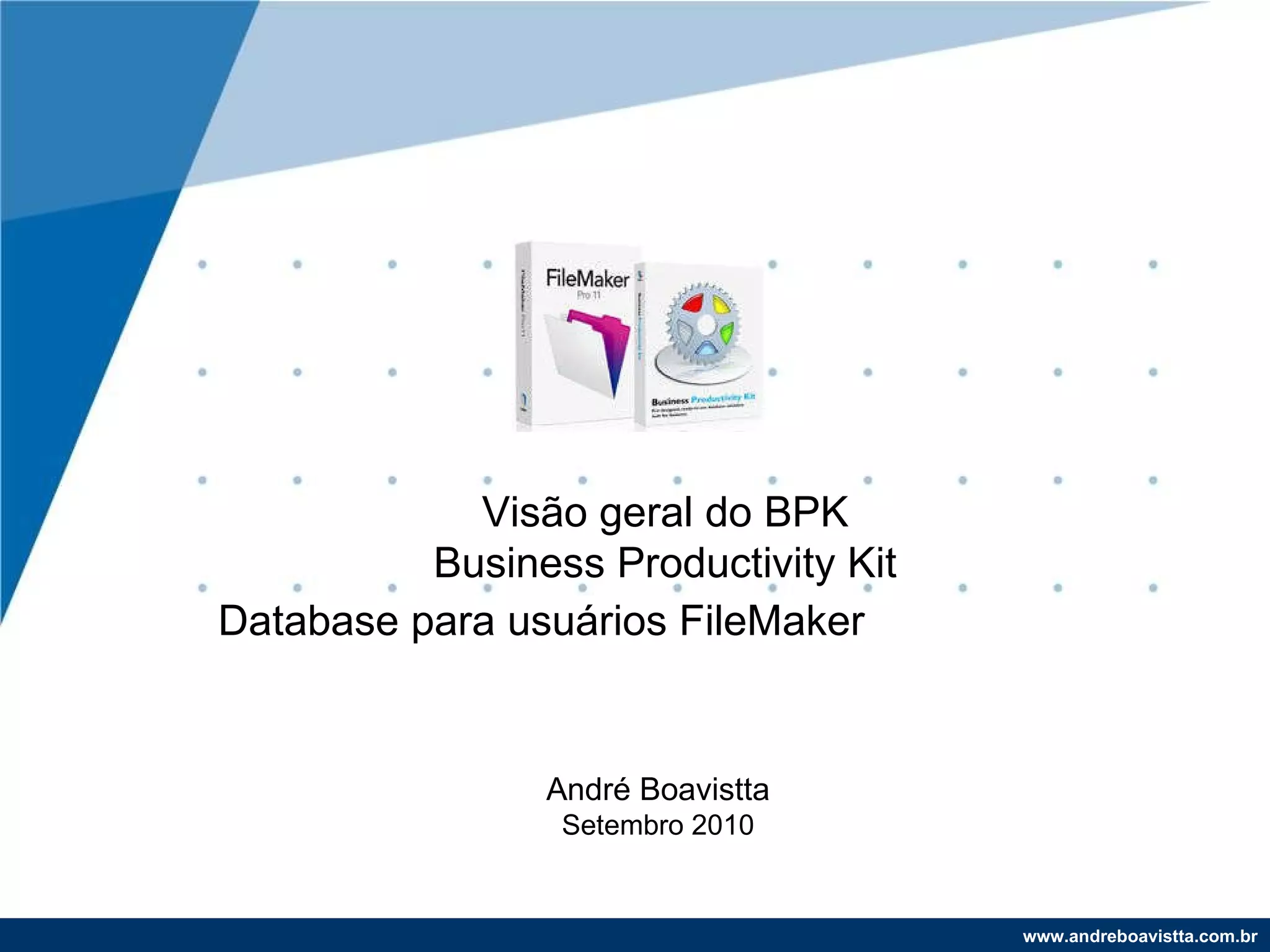 O documento fornece uma visão geral do Business Productivity Kit (BPK) da FileMaker, que é uma solução pronta para uso com módulos integrados de gestão de contatos, estoque, vendas, projetos e marketing por e-mail. O BPK oferece vantagens como facilidade de uso, escalabilidade e baixo custo. É possível personalizar e adicionar novos módulos à solução.
