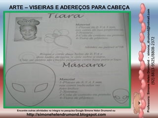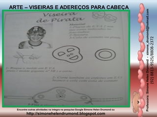 O documento fornece informações sobre uma professora de arte, Simone Helen Drumond, e inclui instruções para fazer viseiras e acessórios para a cabeça, como uma viseira de pirata e uma viseira de coelho.