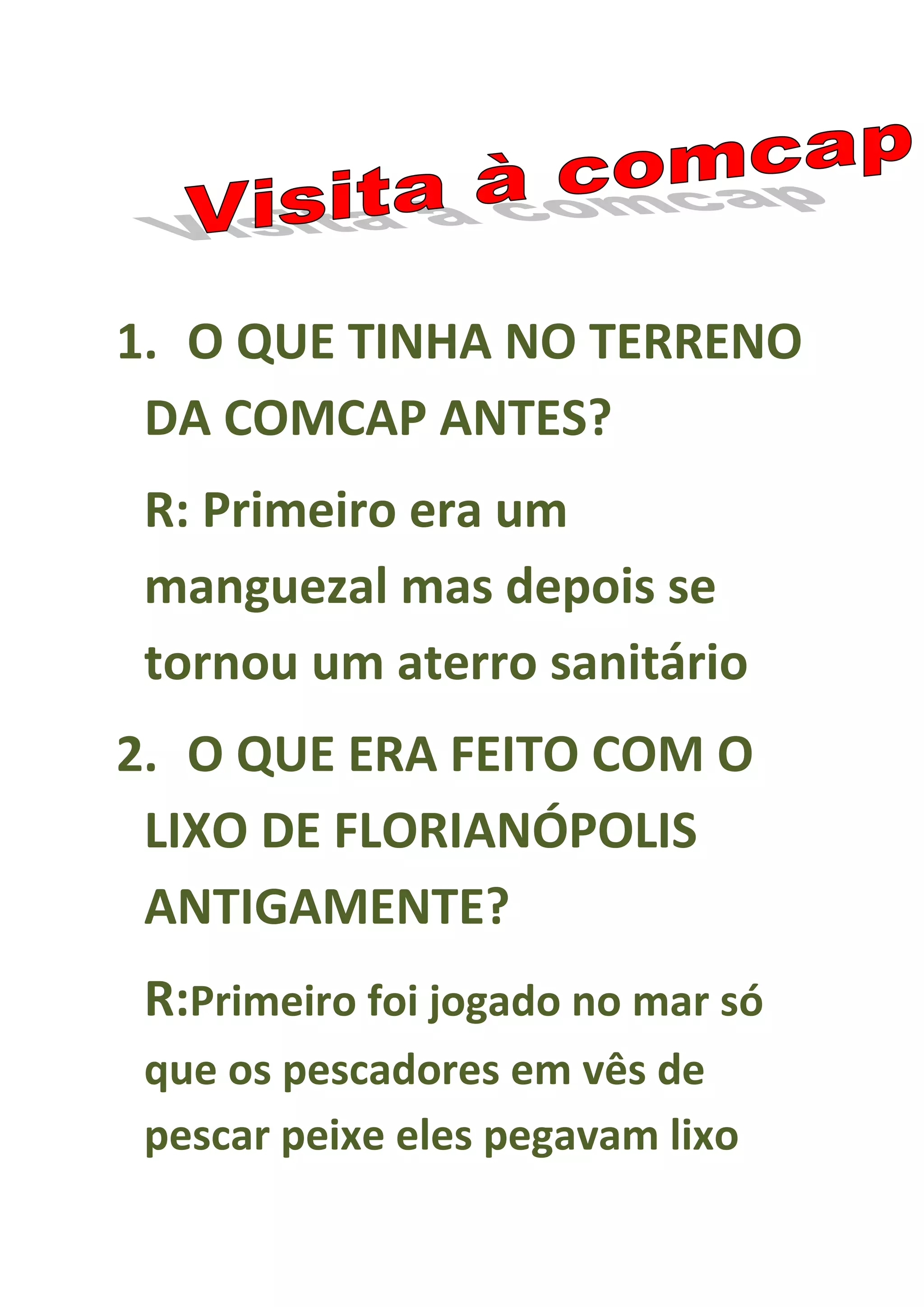 O terreno da Comcap era originalmente um manguezal, mas depois se tornou um aterro sanitário. Antigamente, o lixo de Florianópolis era jogado no mar, mas os pescadores pegavam mais lixo do que peixes, então construíram um trapiche. Posteriormente, o lixo passou a ser queimado ou enterrado. Na Comcap, o lixo é pesado para determinar quanto será pago ao aterro sanitário para recebê-lo.