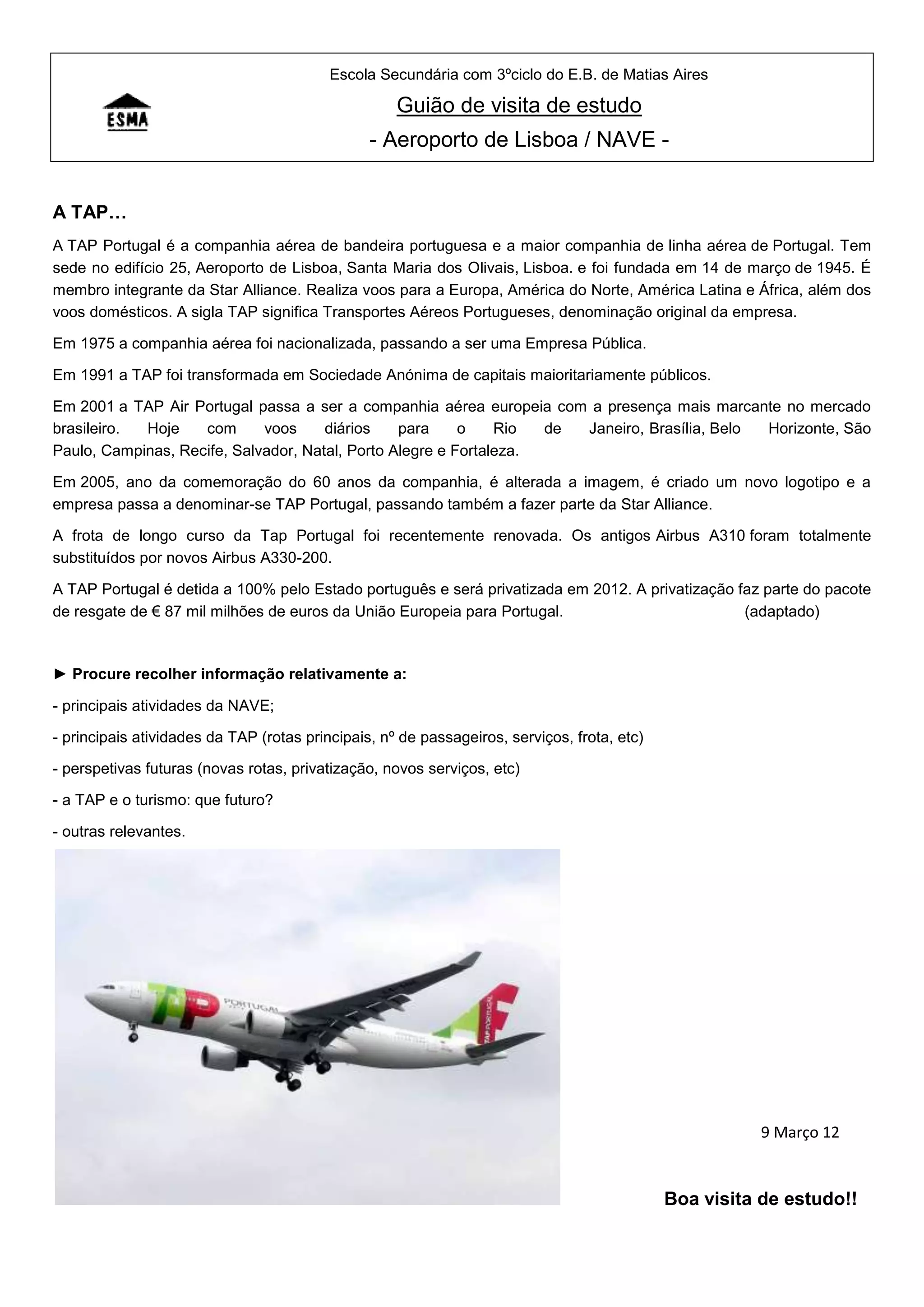 O documento descreve a história da companhia aérea portuguesa TAP desde a sua fundação em 1945 até os planos de privatização em 2012. Detalha como a TAP foi nacionalizada em 1975 e transformada em empresa pública em 1991, e como expandiu suas rotas internacionais, renovou sua frota, e juntou-se à aliança Star Alliance em 2005. O documento sugere tópicos para discussão durante uma visita de estudo ao aeroporto de Lisboa, incluindo as atividades da TAP e seu papel no turismo português.