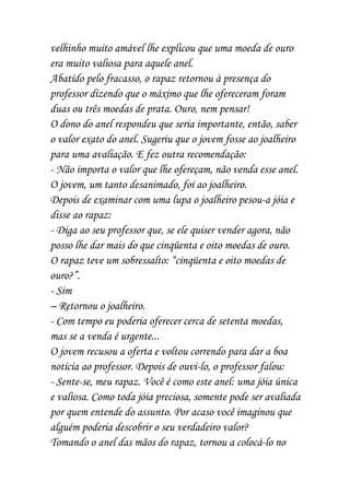 O documento fala sobre um jovem que se sentia inútil e procurou seu professor para pedir conselhos. O professor deu um anel ao jovem e pediu que ele o vendesse por no mínimo uma moeda de ouro. Apesar das tentativas fracassadas de vendê-lo por esse preço, o jovem levou o anel a um joalheiro, que avaliou em 58 moedas de ouro. Isso mostrou ao jovem que seu verdadeiro valor só poderia ser visto por quem entende do assunto.