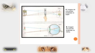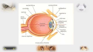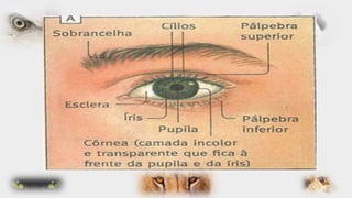 O documento descreve as partes internas e externas do olho humano, incluindo a córnea, íris, retina, cristalino e nervo óptico. Também discute doenças oculares comuns como conjuntivite, glaucoma e catarata, além de fornecer dicas de cuidados com a visão.
