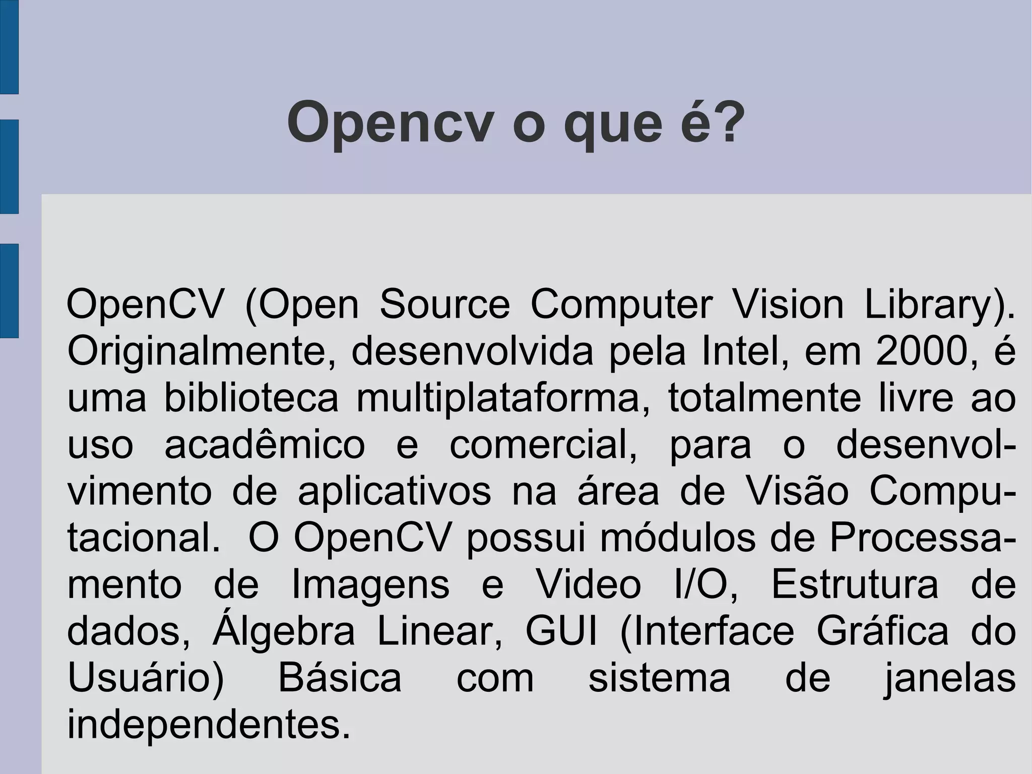 O documento descreve o que é OpenCV, onde é usado e como instalá-lo. OpenCV é uma biblioteca de visão computacional open source usada para reconhecimento facial, de objetos e movimentos. Ele pode ser instalado em sistemas Linux e utilizado para exibir imagens e vídeos, detectar contornos e objetos.