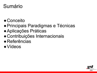 O documento discute visão computacional, definindo-a como a ciência e tecnologia de sistemas artificiais que obtêm informações de imagens. Ele explica os principais paradigmas como reconhecimento, análise de movimento e reconstrução de cena, e aplicações práticas em áreas como agricultura, indústria, medicina e segurança.