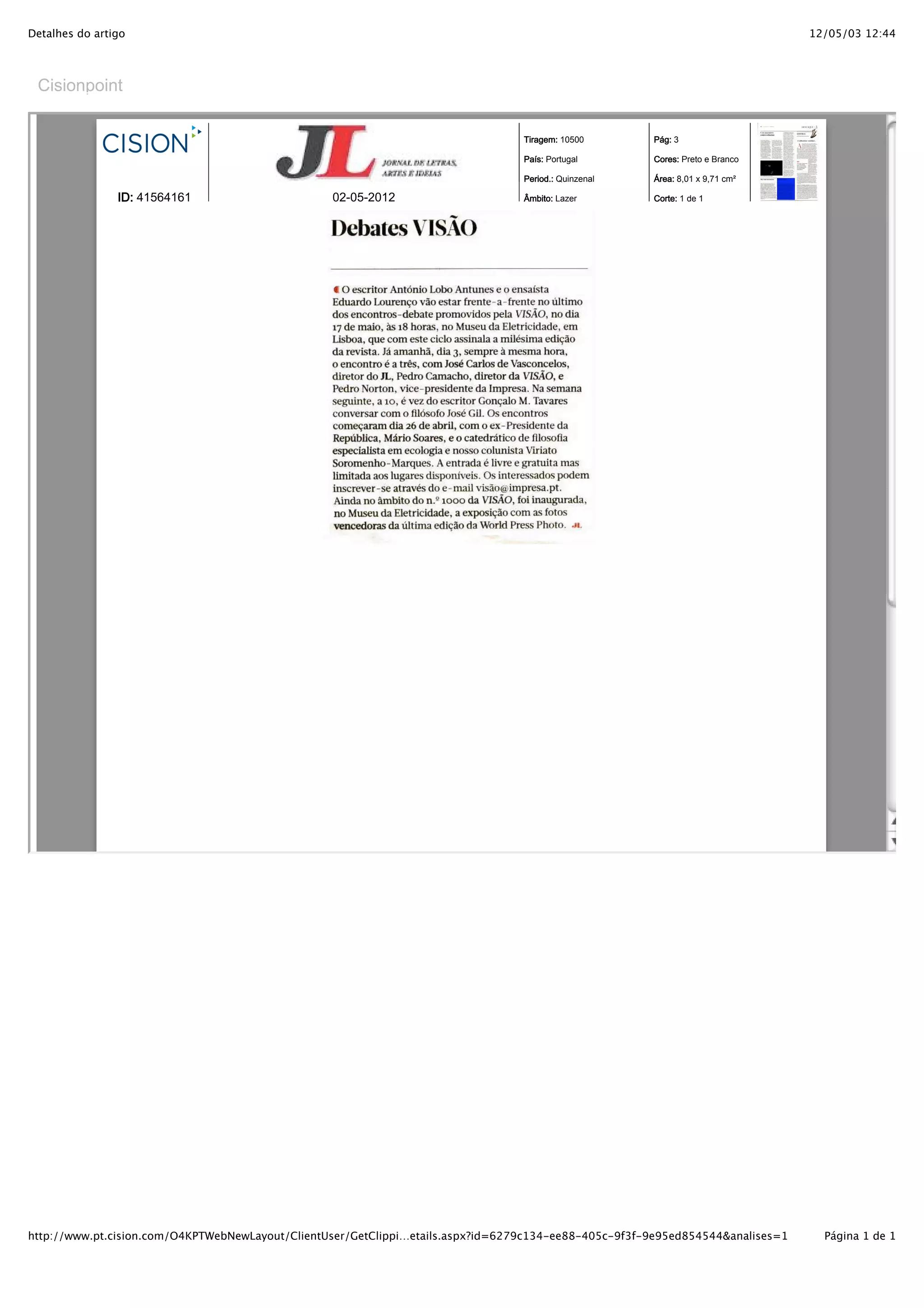 O documento é um recorte de jornal português de 12 de maio de 2003 que discute detalhes de um artigo. O jornal tem uma tiragem de 10.500 cópias e é publicado quinzenalmente em preto e branco com uma área de impressão de 8,01 x 9,71 cm2.