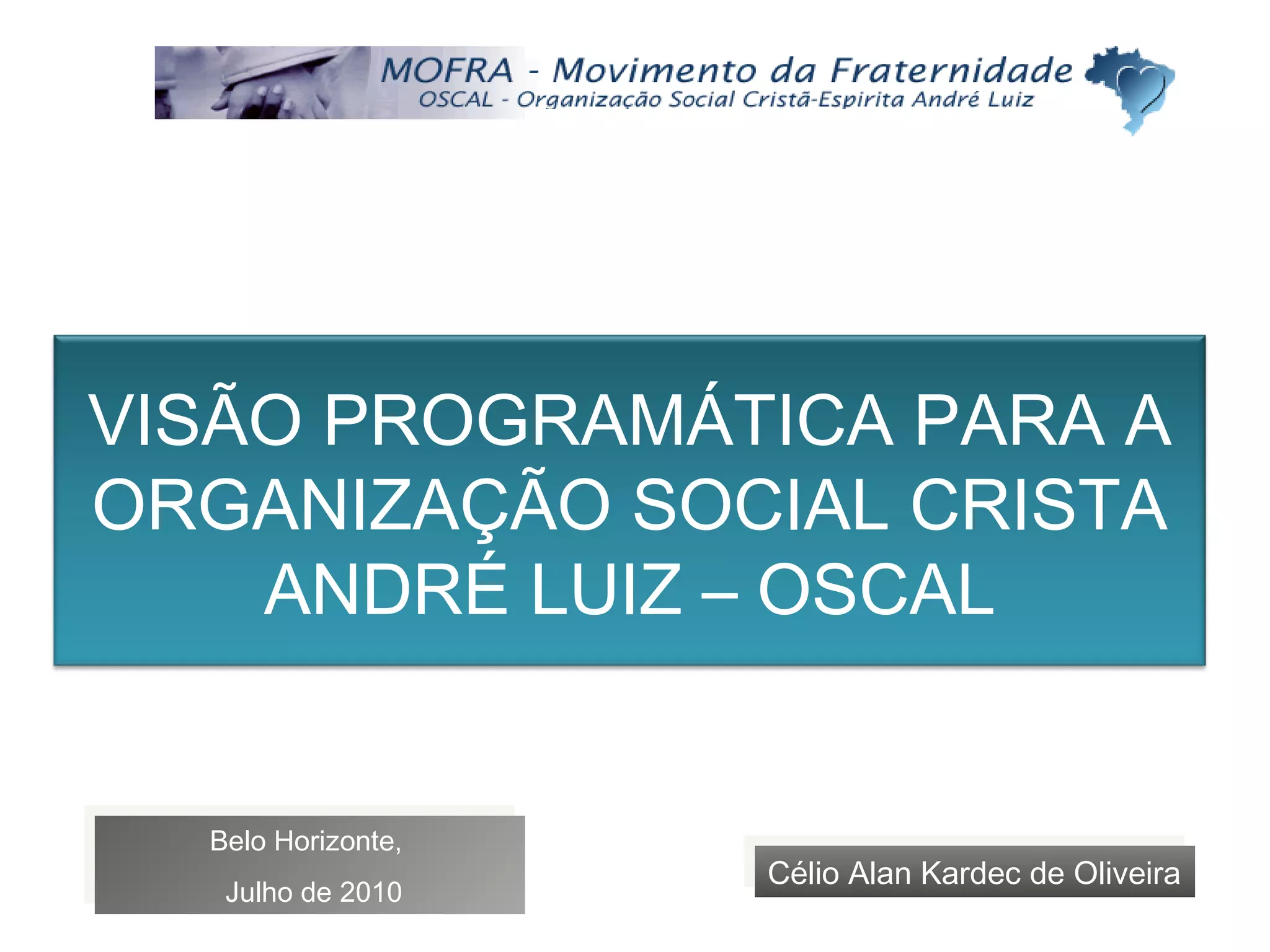 Este documento apresenta uma visão programática e estratégias para a Organização Social Cristã André Luiz (OSCAL) entre 2010-2013, focando em fortalecer os Grupos da Fraternidade Espírita (GFE) e a Cidade da Fraternidade (CIFRATER) através de assistência social, educação, cultivo de valores cristãos e cooperação mútua.