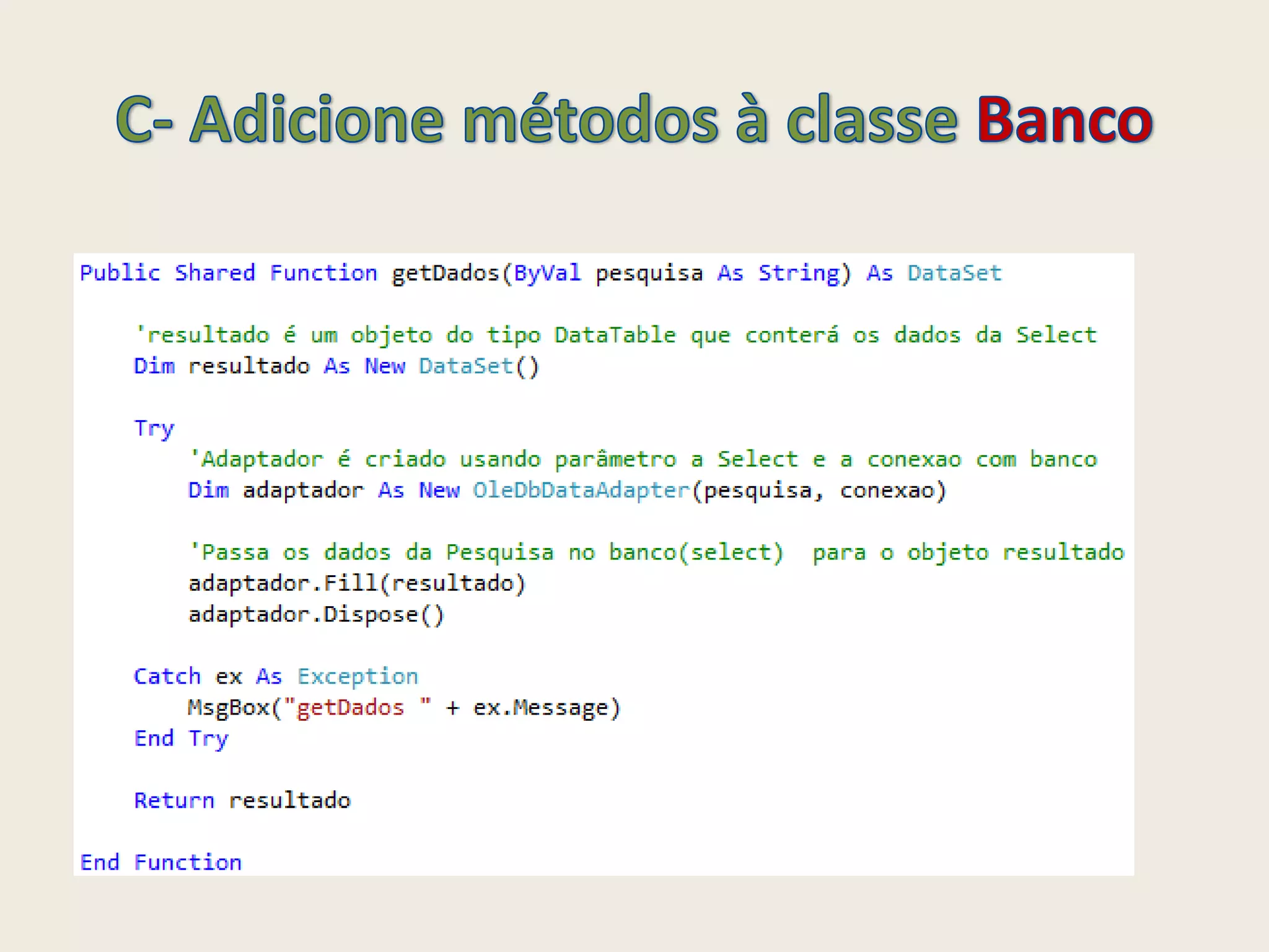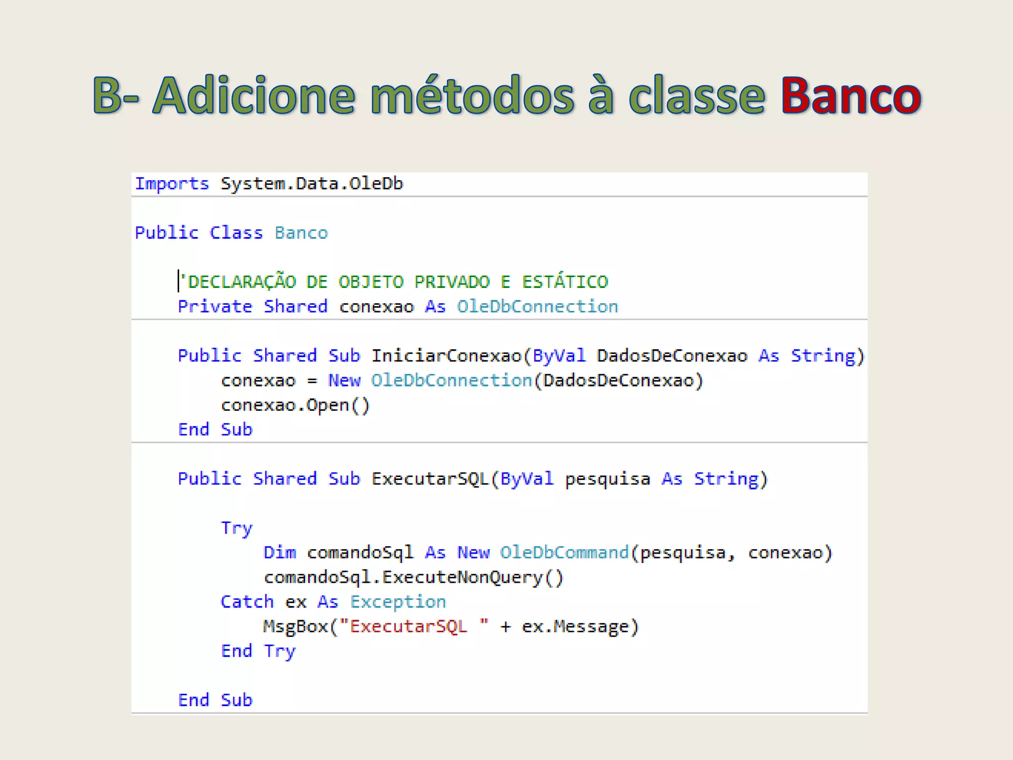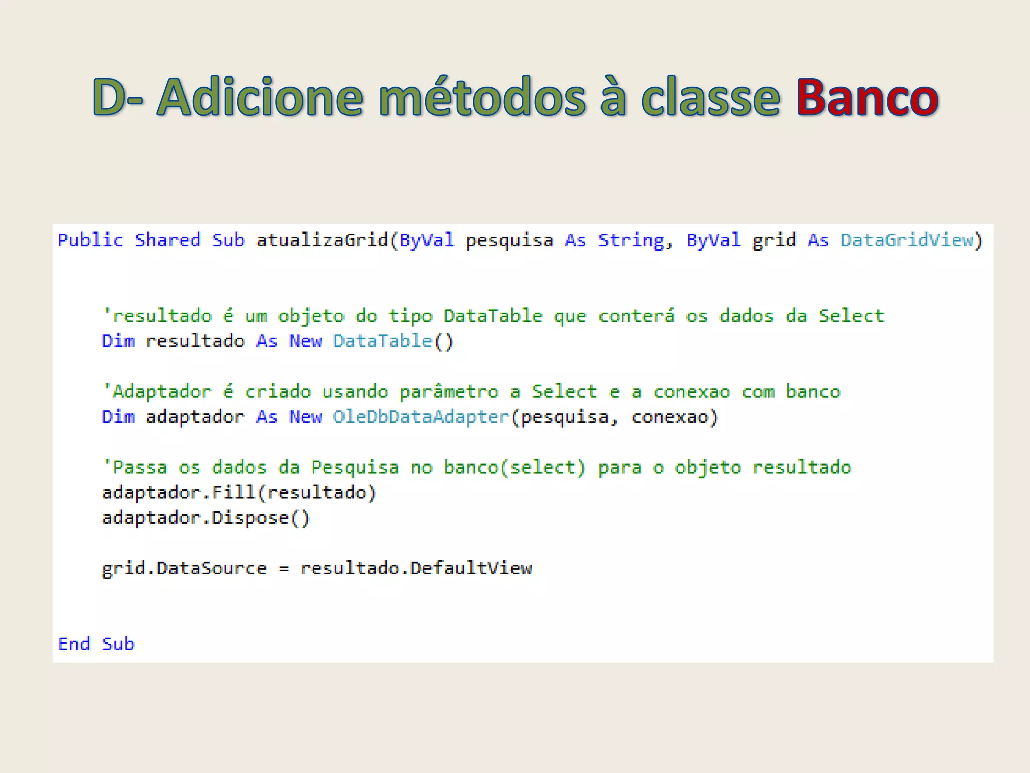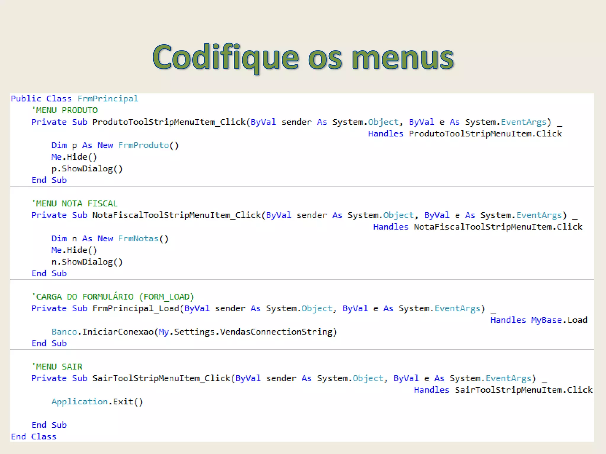 O documento fornece instruções para criar um banco de dados no Visual Basic 2010 com tabelas e relacionamentos, e desenvolver formulários e menus para cadastro de produtos e notas fiscais, conectando-os ao banco de dados. Instruções incluem criar o banco "Vendas.MDB", tabelas "Produto" e "NotaFiscal", projeto no Visual Studio, menus "Cadastros" e "Ajuda", e formulários com controles e conexão de dados.