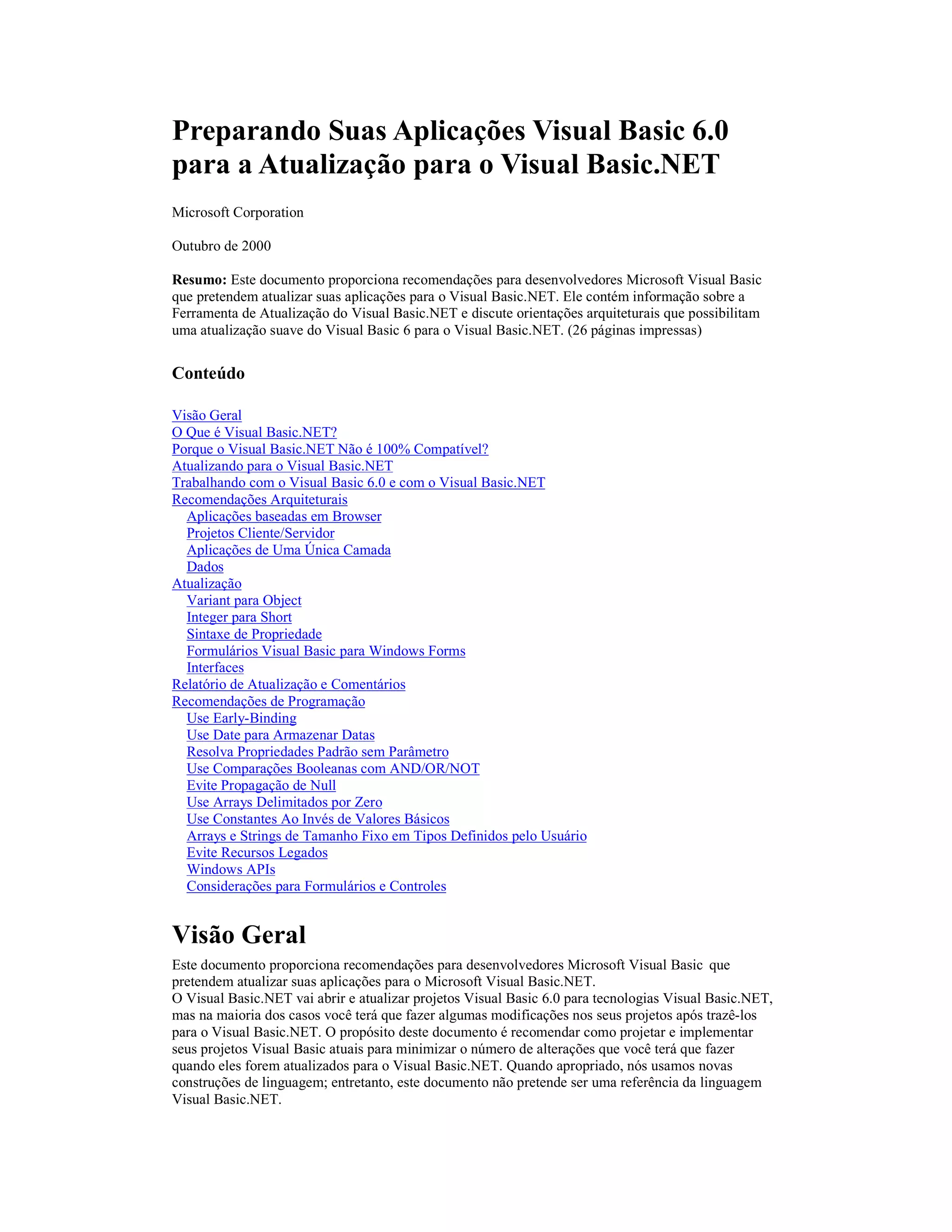 Este documento fornece recomendações para desenvolvedores que pretendem atualizar aplicações Visual Basic 6.0 para o Visual Basic.NET. Ele discute a ferramenta de atualização do Visual Basic.NET e orientações arquiteturais para uma atualização suave, como projetar para aproveitar novos recursos como Windows Forms. O documento também aborda porque o Visual Basic.NET não é totalmente compatível com versões anteriores e como trabalhar com projetos em ambas as tecnologias.