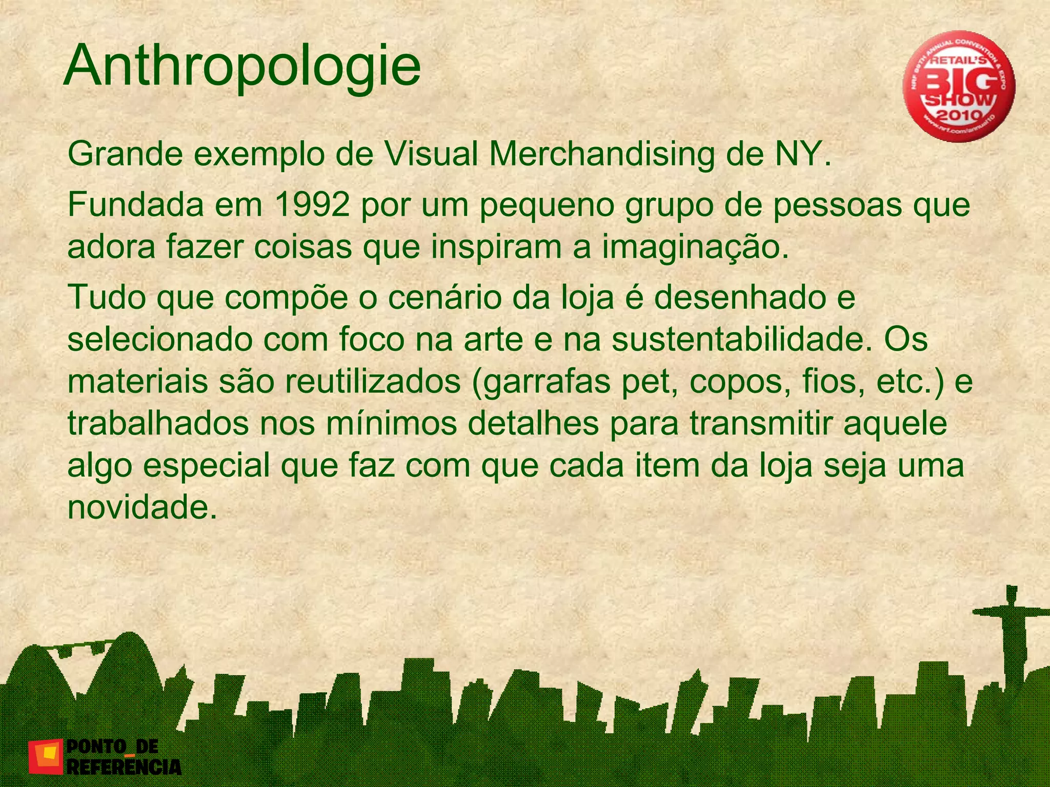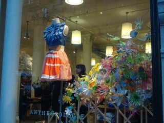 A Anthropologie é uma loja de roupas fundada em 1992 em NY que se destaca pelo visual merchandising inspirador e sustentável. Os materiais reutilizados são trabalhados com atenção aos detalhes para transmitir uma sensação de novidade em cada item da loja.