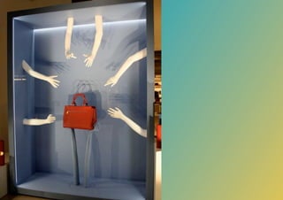 O documento discute várias técnicas e estratégias de visual merchandising para captar a atenção dos clientes, como contar boas histórias sobre os produtos, criar uma experiência positiva na loja através do design, iluminação, temperatura e cheiro, e usar vitrines e montras de forma atraente. Também aborda o uso de eventos, pop-ups, e-commerce e redes sociais para promover as vendas.