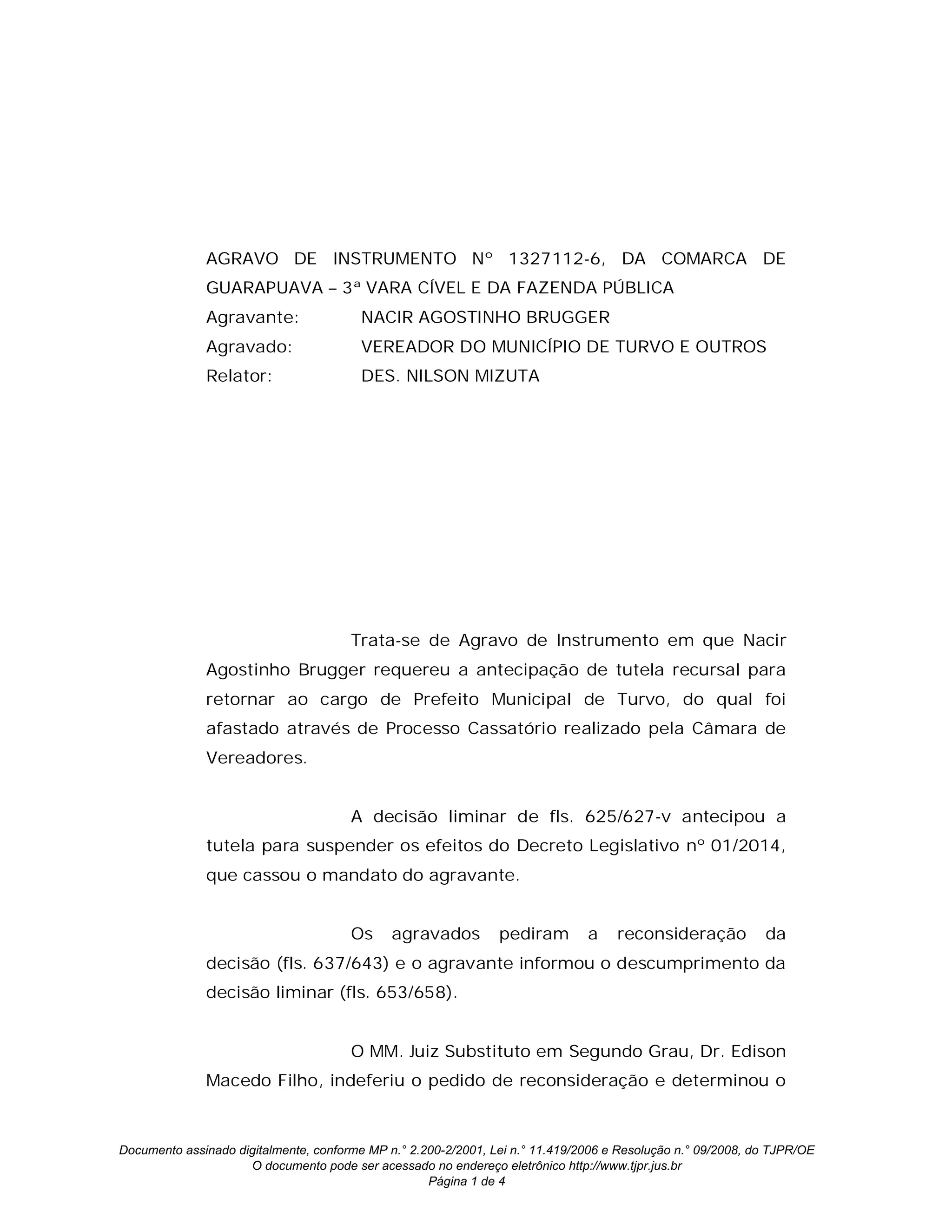 Este documento trata de um Agravo de Instrumento no qual Nacir Agostinho Brugger requereu a antecipação de tutela recursal para retornar ao cargo de Prefeito Municipal de Turvo, do qual foi afastado através de um Processo Cassatório realizado pela Câmara de Vereadores. A decisão liminar concedeu a tutela para suspender os efeitos do decreto legislativo que cassou o mandato do agravante, porém não impediu a continuidade do processo cassatório.