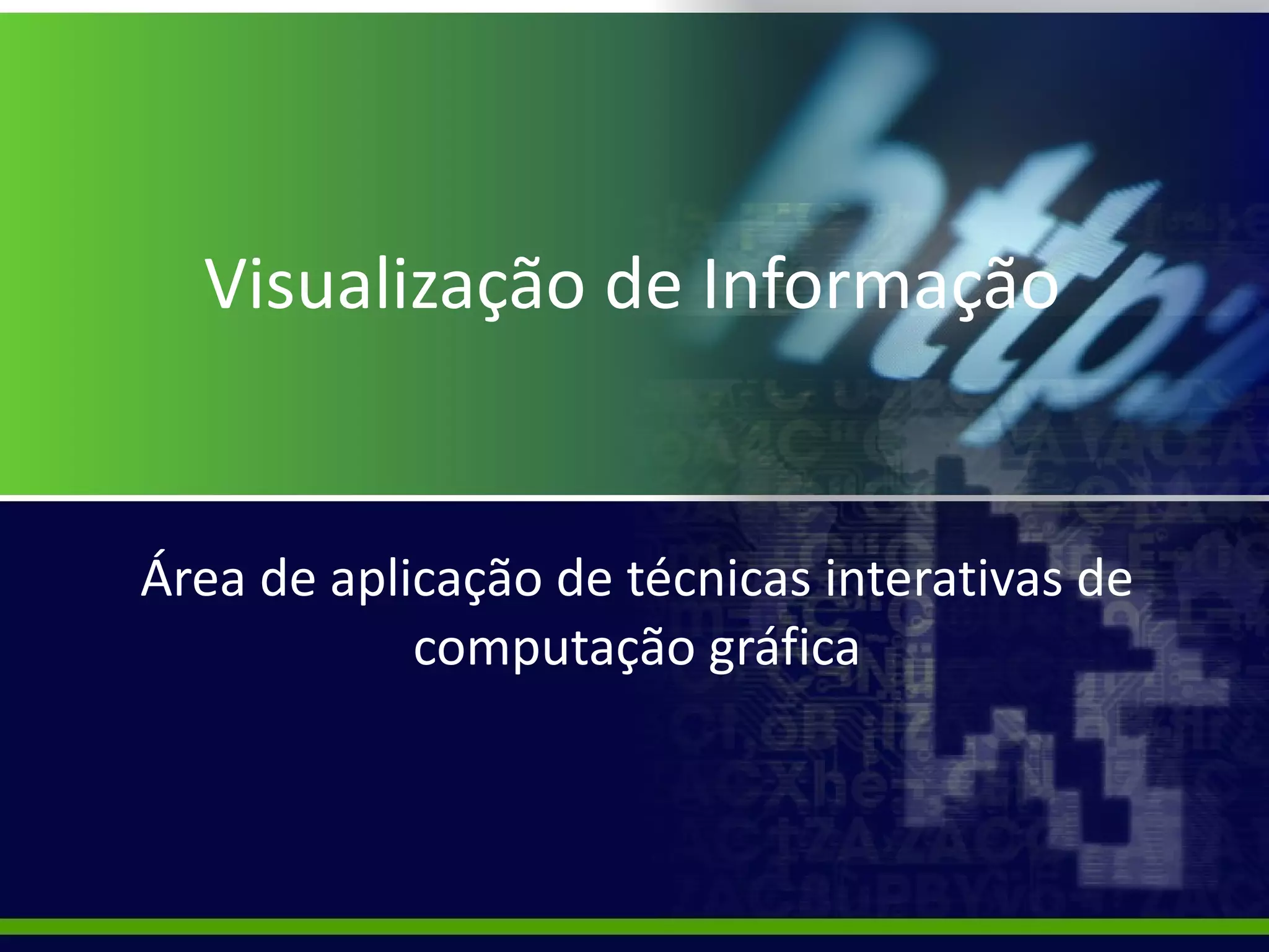 A visualização da informação auxilia na análise e compreensão de conjuntos de dados ampliando a cognição do usuário por meio de técnicas interativas de computação gráfica bidimensionais, tridimensionais e multidimensionais. É importante que a visualização seja elegante e atraente aos olhos, combinando aspectos de computação gráfica, interfaces humano-computador, cartografia e mineração de dados.