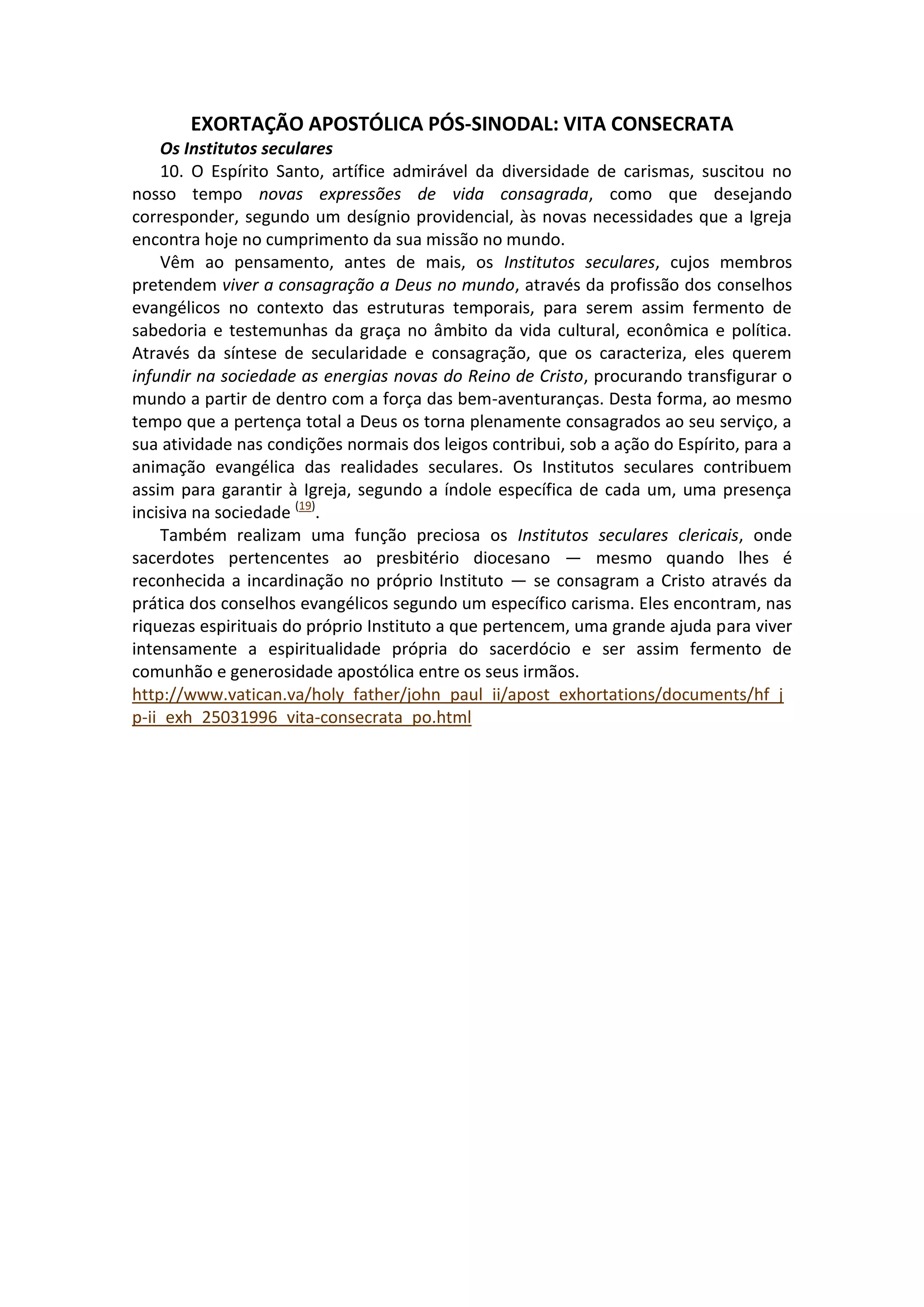 O documento descreve os Institutos seculares e seus objetivos de viver a consagração a Deus no mundo enquanto promovem as energias do Reino de Cristo na sociedade. Também destaca os Institutos seculares clericais, onde sacerdotes se consagram a Cristo através dos conselhos evangélicos de acordo com um carisma específico e encontram apoio espiritual no Instituto para viver intensamente a espiritualidade sacerdotal.